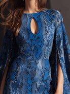 The design features a sculpted bodice with a delicately contoured keyhole cutout that adds a sensual yet tasteful focal point to the neckline. This subtle opening elongates the upper body and brings a touch of sophistication to an otherwise daring print. Flowing seamlessly from the shoulders, the split cape sleeves make this dress truly unforgettable.