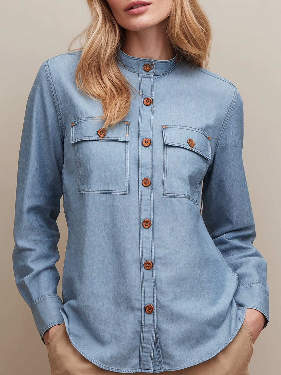 A modern reinterpretation of classic denim, the Light Blue Utility-Inspired Denim Shirt combines minimalism with subtle structure. Designed from soft, breathable denim in a washed pastel hue, it features a stand collar and button-front closure with statement wooden buttons for a refined natural touch.