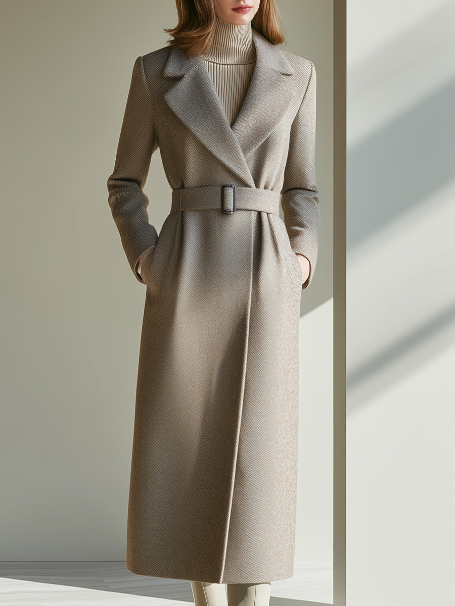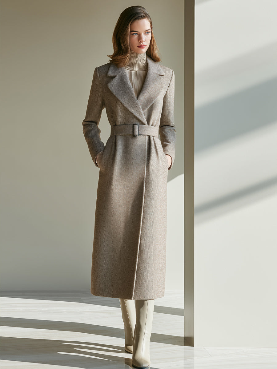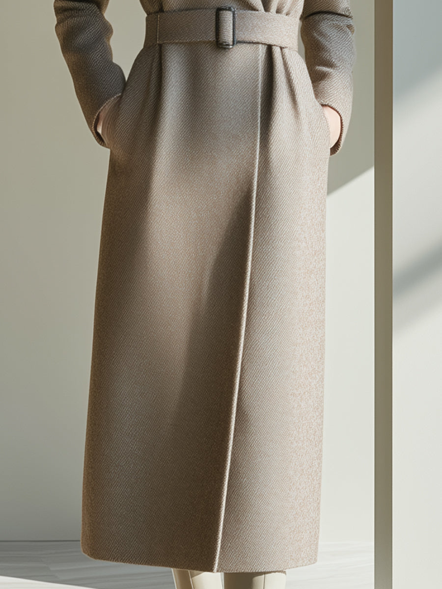 Crovaya elevates outerwear with the Longline Tailored Belted Coat in Beige, a modern classic designed for the confident professional woman. Blending structure, refinement, and contemporary ease, this coat is crafted to endure as a wardrobe cornerstone for autumn and winter. Featuring a sharply tailored silhouette, the coat highlights defined shoulders, a belted waist for sculpted definition, and a full-length hemline that exudes elegance. Its neutral beige tone reflects timeless sophistication, allowing effortless styling with monochrome palettes or layered neutrals. The wide lapels enhance its architectural shape, striking a perfect balance between modern minimalism and classic tailoring.