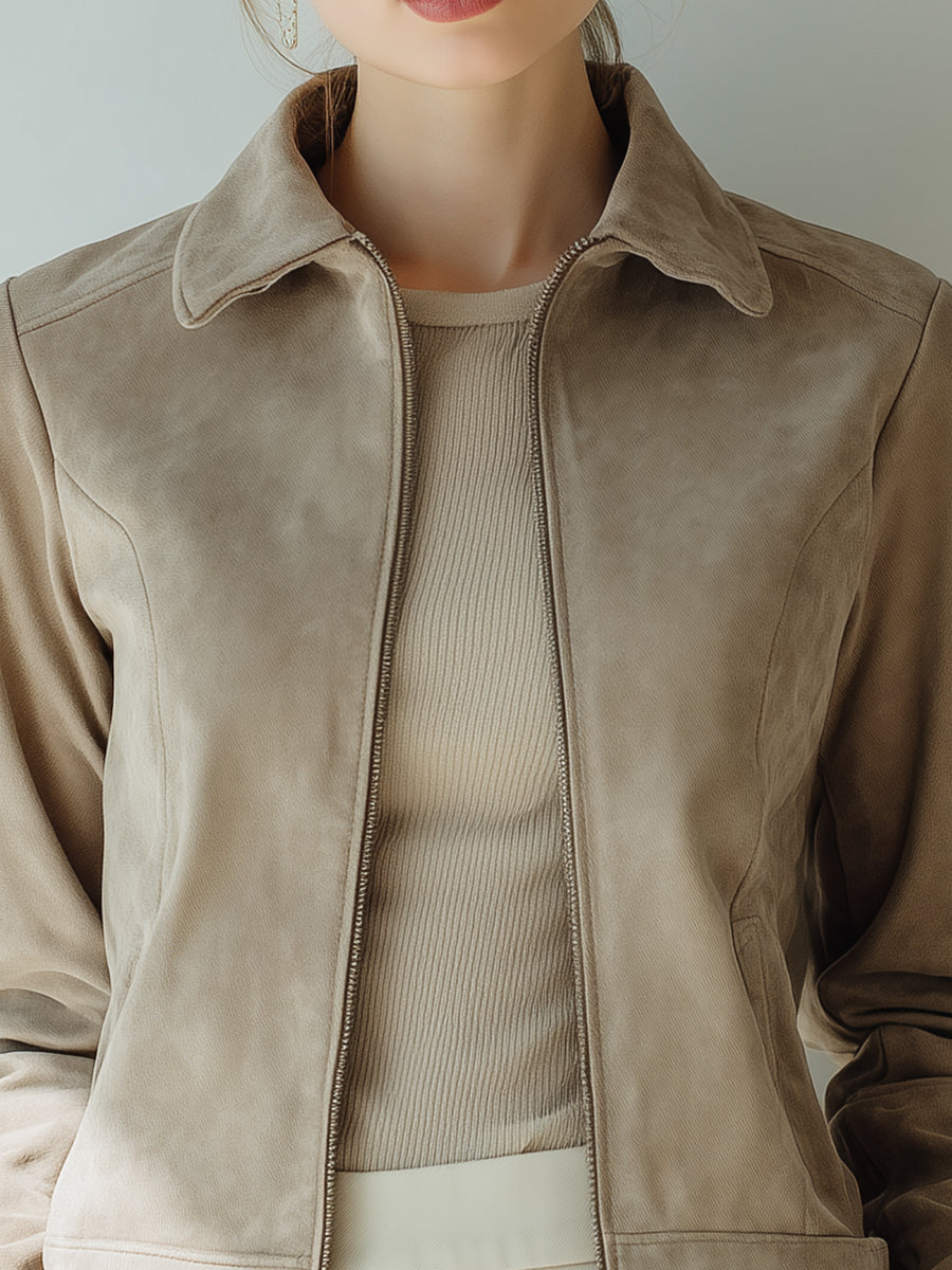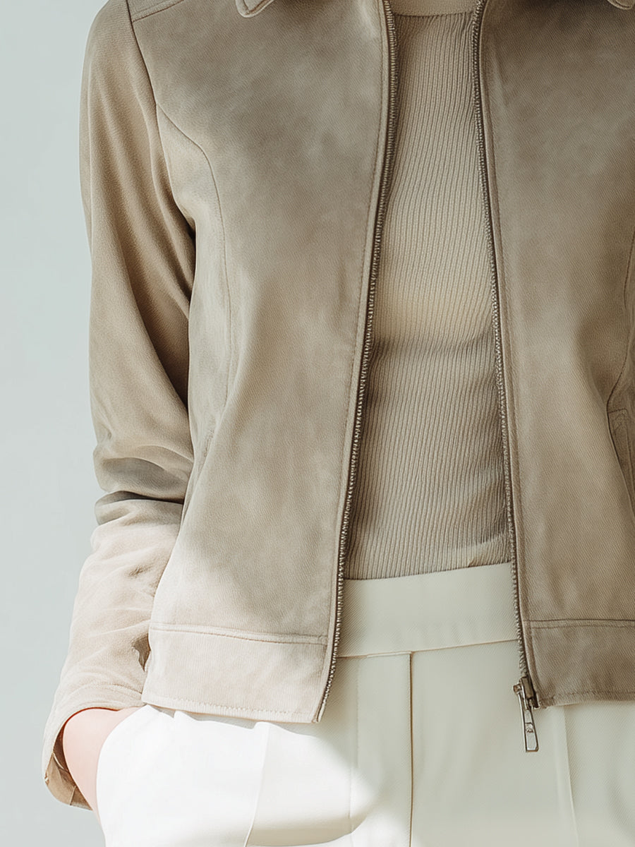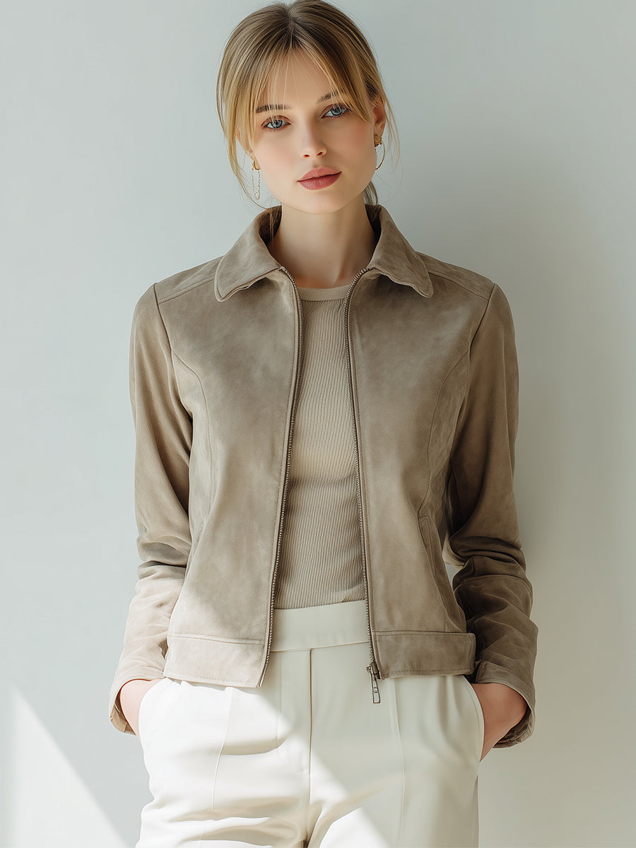 Luxurious Suede Zip-Up Jacket In Soft Taupe