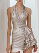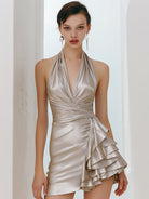 The Metallic Sheen Halter Ruched Mini Dress captures modern glamour through refined craftsmanship and contemporary design. Created from high-shine satin with a soft metallic glow, the dress beautifully contours the body while maintaining a smooth, fluid surface. Its halter neckline enhances the shoulders and collarbone, delivering an elegant yet bold silhouette. The deep V-front adds confidence without compromising sophistication.