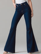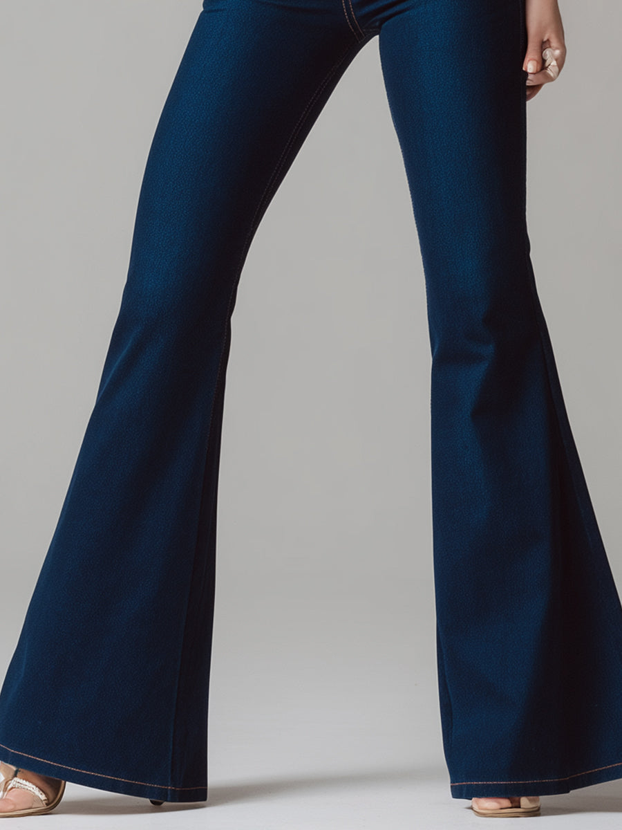Timelessly elegant yet strikingly modern, the Midnight Flare High-Rise Denim Pants redefine everyday sophistication. Crafted from premium stretch denim in a deep indigo wash, these jeans elongate the silhouette with a high-waisted fit and dramatic flared legs. The structured waistband sculpts the waistline, while the clean vertical seams create a slimming effect from hip to hem.
