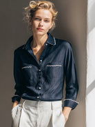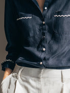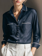 Its deep navy tone exudes quiet confidence, perfectly balanced by soft detailing that enhances its charm. Whether paired with high-waisted trousers for a refined office look or styled casually with denim, this shirt epitomizes modern elegance infused with character—an essential addition to the contemporary wardrobe.