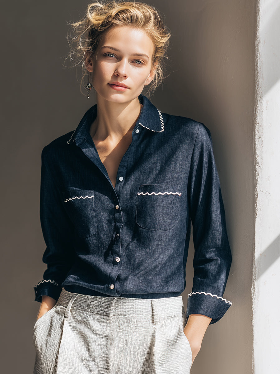 The Navy Trim Detail Button-Up Shirt captures understated sophistication with a touch of playful refinement. Crafted from lightweight cotton-blend fabric with a subtle sheen, this shirt features delicate white scalloped trims tracing the collar, cuffs, and pockets—adding a feminine twist to a timeless silhouette. The tailored structure flatters the figure while ensuring day-long comfort, making it an effortless choice for both business and casual settings.