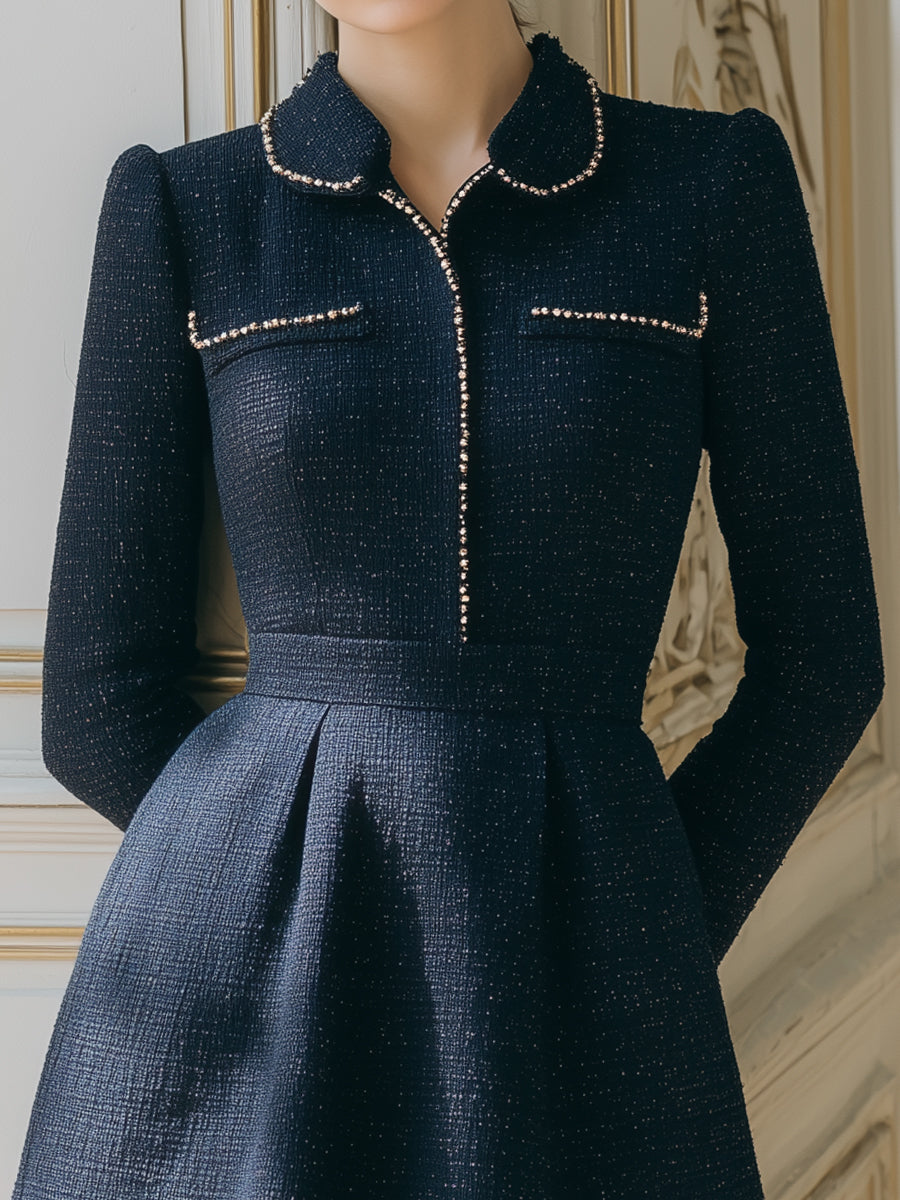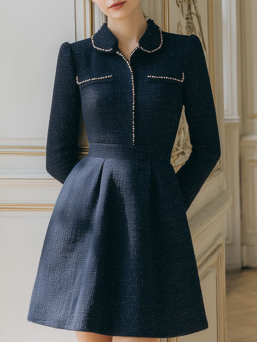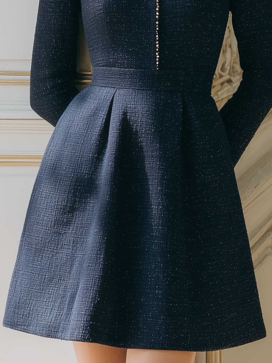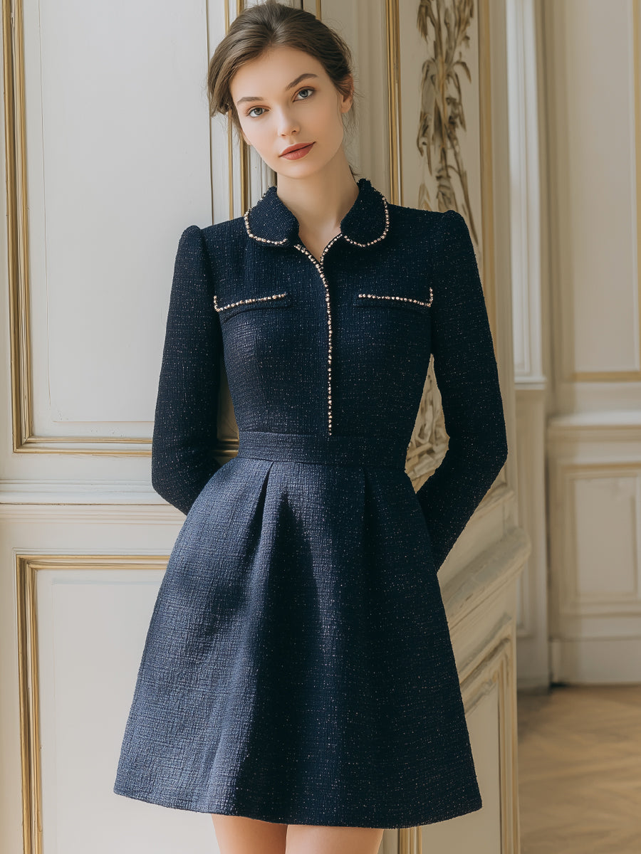 Crovaya unveils the Navy Tweed Mini Dress — a masterpiece of modern elegance infused with timeless Parisian charm. Crafted from refined tweed with a hint of luster, this dress features pearl-trimmed details that delicately trace the collar, front placket, and pockets. The structured bodice and softly pleated skirt evoke a flattering, feminine silhouette that balances grace with authority.