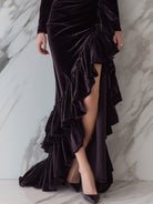 The highlight lies in its cascading ruffle panels, which flow asymmetrically along the silhouette, creating fluid movement and theatrical impact. A high slit beneath the ruffle offers glimpses of leg with each stride, balancing allure with sophistication. The deep plum hue, enhanced by velvet’s luster, speaks to quiet opulence and regal femininity.