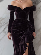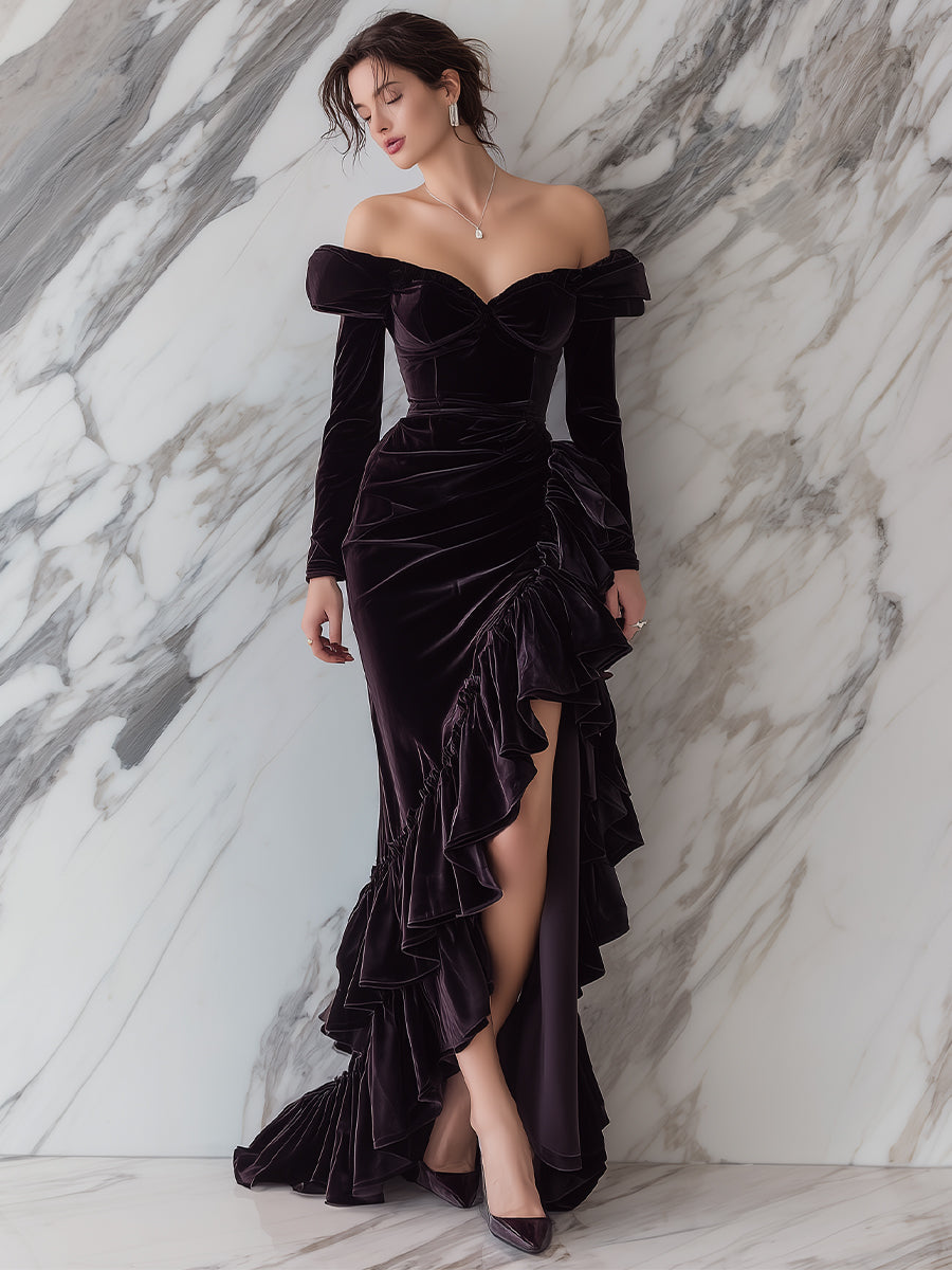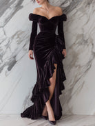Off-Shoulder Plum Velvet Gown With Cascading Ruffles