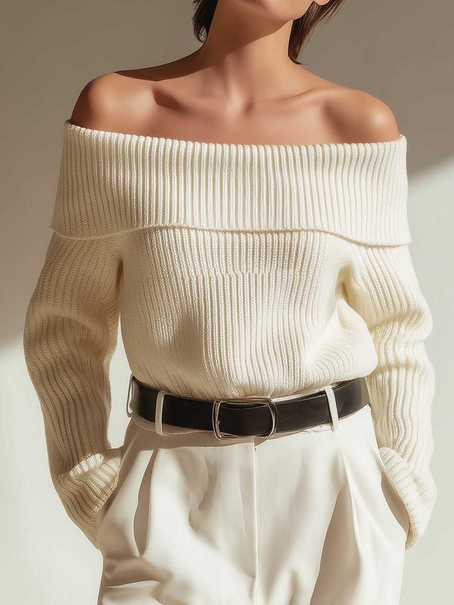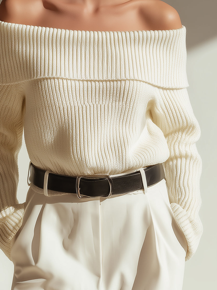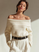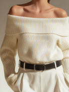 Crovaya unveils the Off-Shoulder Ribbed Knit Sweater — a piece that redefines sensual minimalism through texture and silhouette. The ivory hue exudes quiet sophistication, while the wide off-shoulder neckline brings a touch of effortless femininity. Crafted from finely ribbed knit, the fabric hugs the body comfortably, emphasizing fluid lines and natural movement.