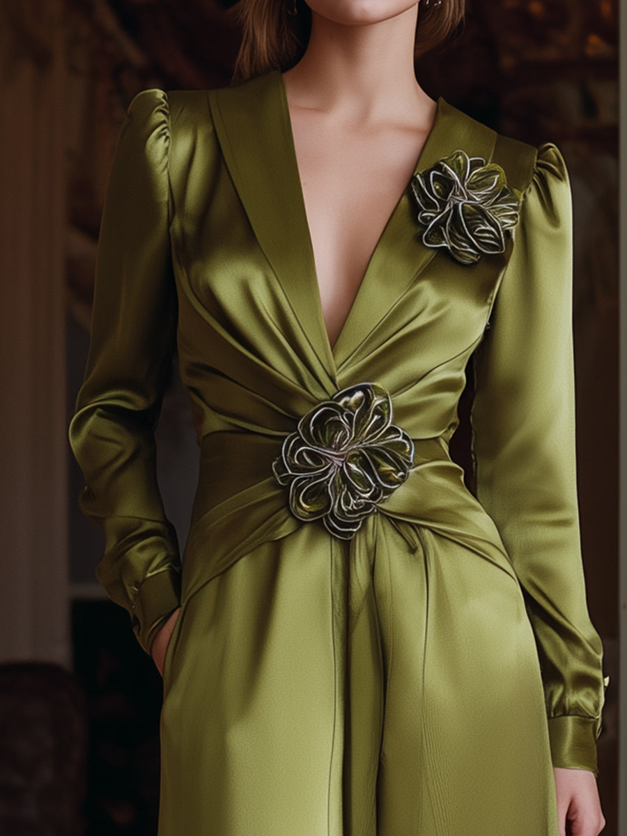 The Olive Green Satin Flower-Belt Midi Dress captures the essence of artful femininity and modern opulence. Crafted from luminous satin, it showcases a plunging neckline framed by soft gathers and a structured waist adorned with hand-sculpted satin floral appliqués. The subtle puff shoulders and midi-length hem create a balanced silhouette — powerful yet effortlessly graceful.