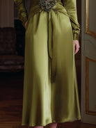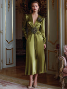 The olive tone introduces depth and sophistication, perfect for women who embrace color with confidence. Elegant yet daring, this dress is ideal for art gallery openings, autumn soirées, and high-profile dinners. The sheen of the fabric enhances movement, giving each step a refined allure reminiscent of couture draping.
