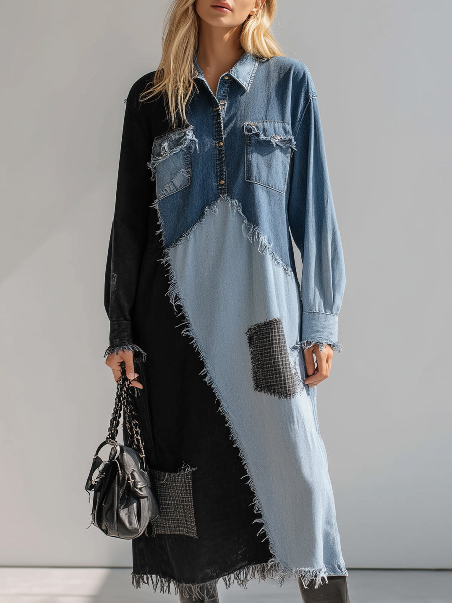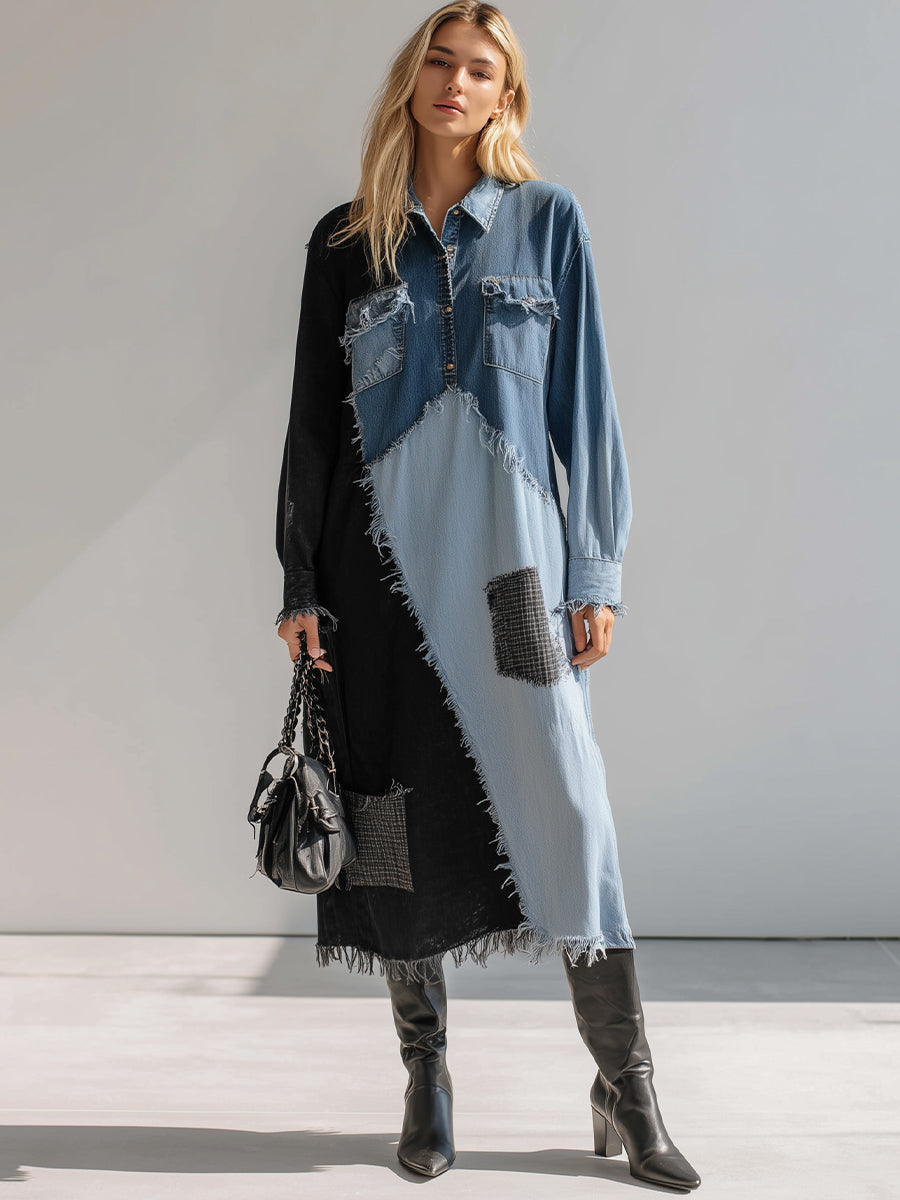 This patchwork two-tone long denim dress is an artistic statement of modern craftsmanship and individuality. Expertly assembled from contrasting denim panels in black, indigo, and sky blue, the asymmetrical design creates striking visual depth. The raw frayed edges and irregular patch placements add a deconstructed aesthetic, while the shirt-style collar and button front retain classic denim integrity. The full-length silhouette delivers effortless elegance, complemented by long sleeves and practical patch pockets.