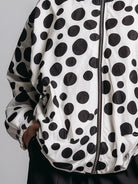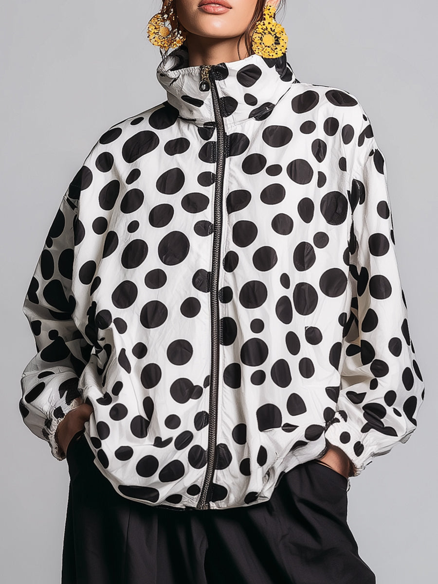 The jacket features a full-length zipper closure, a high collar, and a relaxed, oversized silhouette, creating a comfortable and flattering fit. Its all-over polka dot print adds a fun, retro-inspired element, bringing an element of boldness to your wardrobe. Whether worn casually with jeans or paired with more tailored pieces, this jacket seamlessly integrates into a variety of styling options.