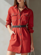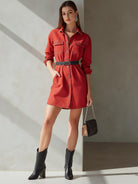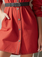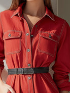 This red denim button-down mini dress redefines casual chic with its confident silhouette and rich, warm tone. Designed from high-quality cotton denim, it features precise contrast stitching, flap chest pockets, and a full-length button closure for a structured yet relaxed look. The addition of a sleek black belt accentuates the waist, creating a flattering feminine shape.