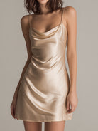 The design features a beautifully draped cowl neckline that creates soft, natural folds, enhancing the dress’s romantic allure. Thin, delicate straps accentuate the shoulders and neckline, lending an air of understated sophistication. The mini-length cut further elevates the silhouette, striking a perfect balance between youthful confidence and elevated chic. With its smooth, lustrous finish, the satin fabric catches the light from every angle, giving the dress a soft, radiant glow that enhances the wearer’s natural presence.