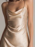 - Design: Cowl-neck satin slip mini dress with delicate straps