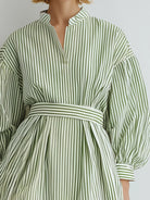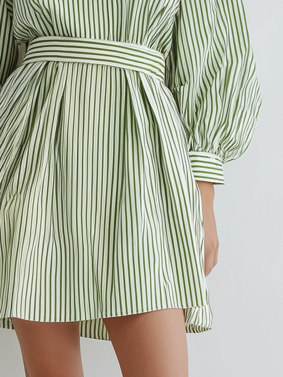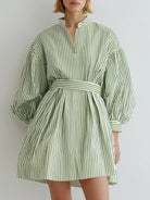 - Design: Striped shirt dress with band collar, split neckline, balloon sleeves, and adjustable belt