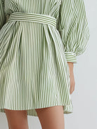 Crovaya presents a refreshing interpretation of the classic shirt dress — a piece defined by crisp lines, airy movement, and modern femininity. This striped belted dress is designed for women who appreciate effortless style elevated by thoughtful tailoring and sculptural volume. Its clean, vertical stripe pattern elongates the figure, bringing an elegant sense of balance to its soft, relaxed silhouette.