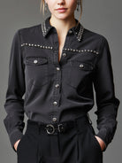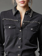 Add a touch of glam to your wardrobe with the Studded Denim Shirt with Belted Detail. This shirt features a classic button-up design adorned with sparkling studded embellishments along the shoulders, collar, and front pockets, offering just the right amount of edge. The fitted waist belt cinches for a flattering shape, adding definition to the classic denim shirt silhouette.