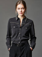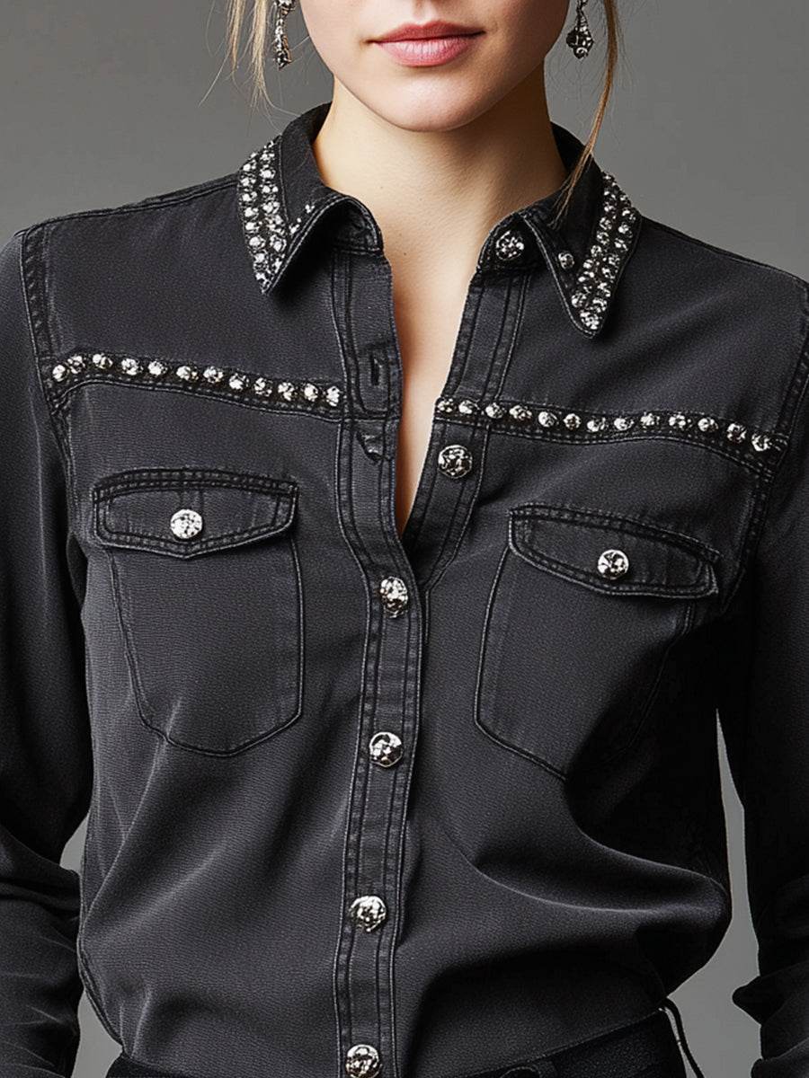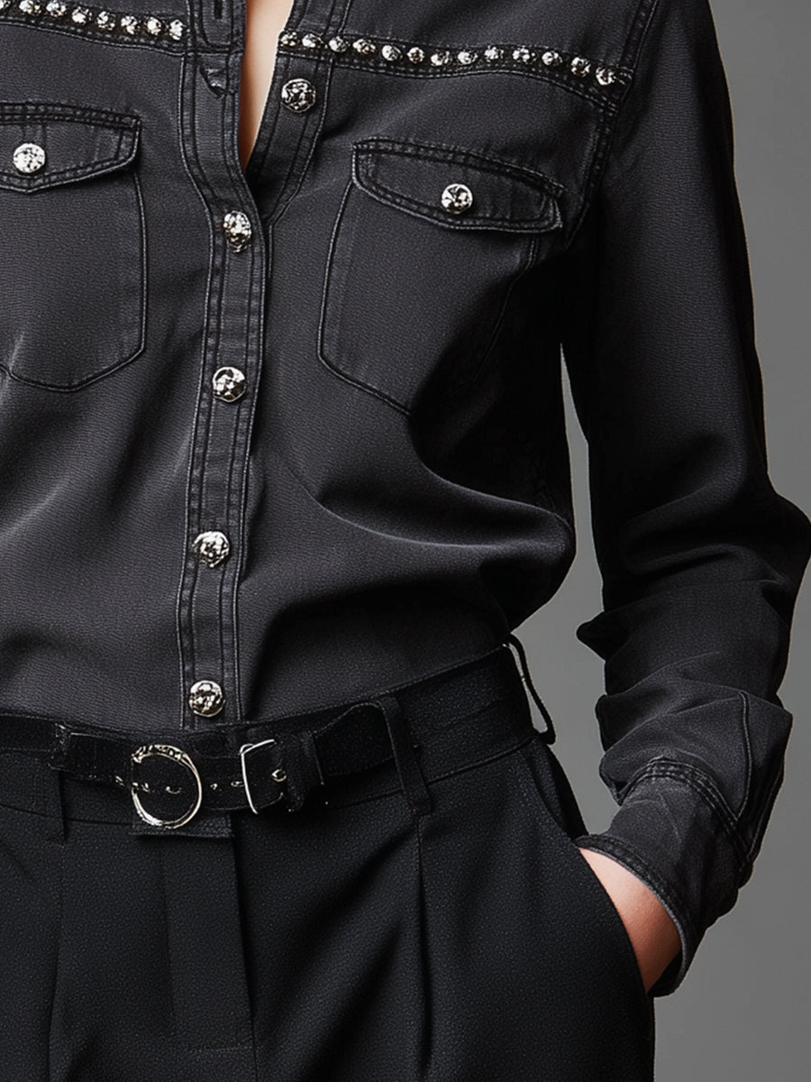 This shirt can easily transition from day to night—style it with sleek trousers and heels for a bold evening look, or keep it casual with fitted jeans and sandals. The combination of soft denim and luxe details ensures it will stand out as both a statement piece and a wardrobe staple. Perfect for the fashion-forward woman, this shirt exemplifies Crovaya' commitment to creating statement-making, versatile pieces.