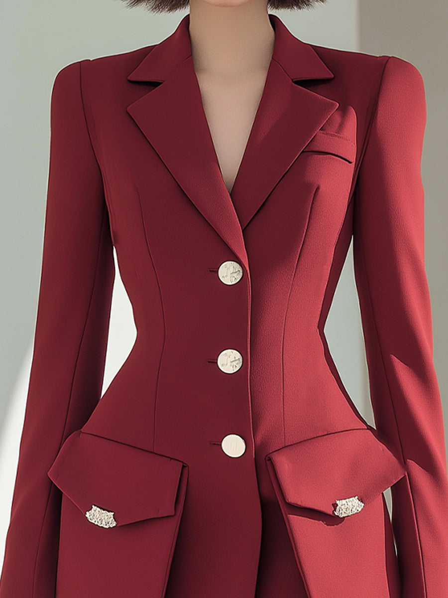 This chic burgundy blazer dress is a bold yet refined piece that combines tailored sophistication with modern edge. Crafted from a structured fabric, the dress features sharp lines that create a flattering silhouette, with a subtle flare at the hem that adds movement. The oversized, crystal-embellished pockets are a standout detail, offering a unique balance between utility and luxury.