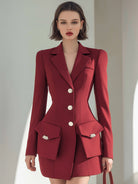 The classic notched lapels and gold-tone buttons add to the timeless appeal of this design, making it perfect for a professional setting, an upscale cocktail party, or a fashion-forward evening event. The long sleeves give it a sleek, polished look, while the mini-length skirt brings a youthful, confident vibe. Wear it as a statement piece at your next evening event or pair it with boots for an edgy street style.