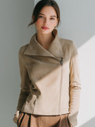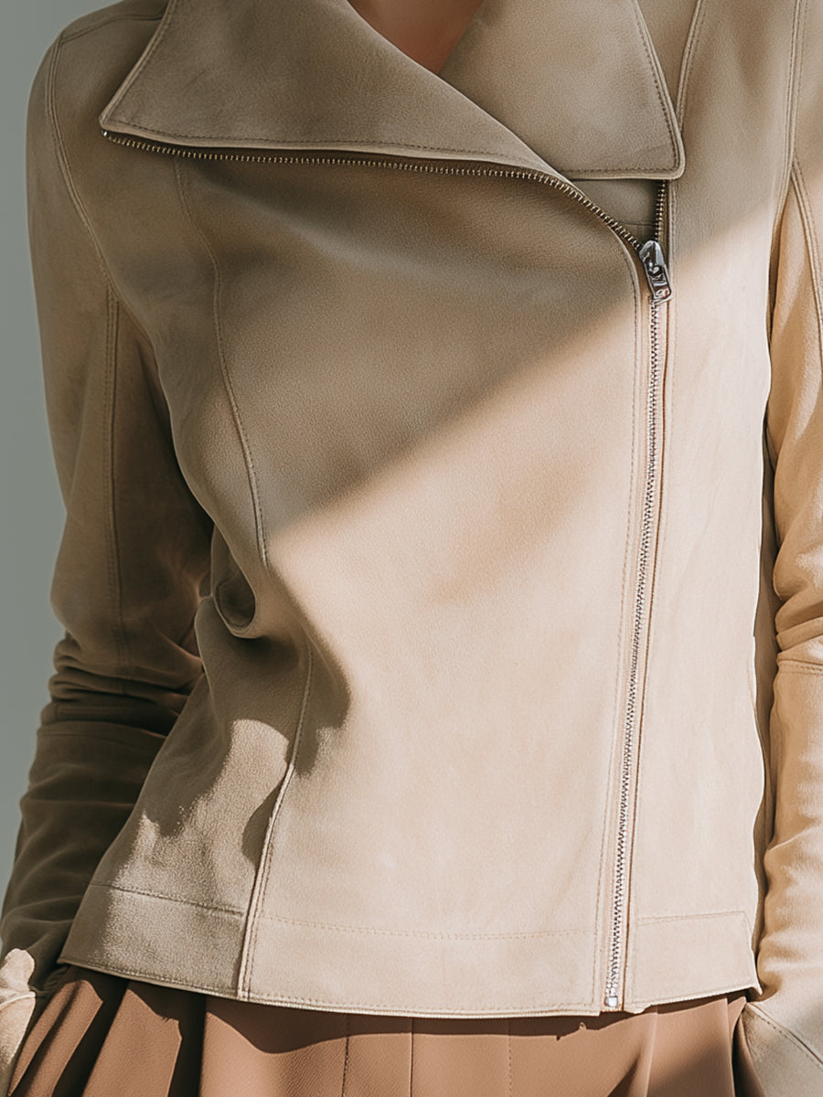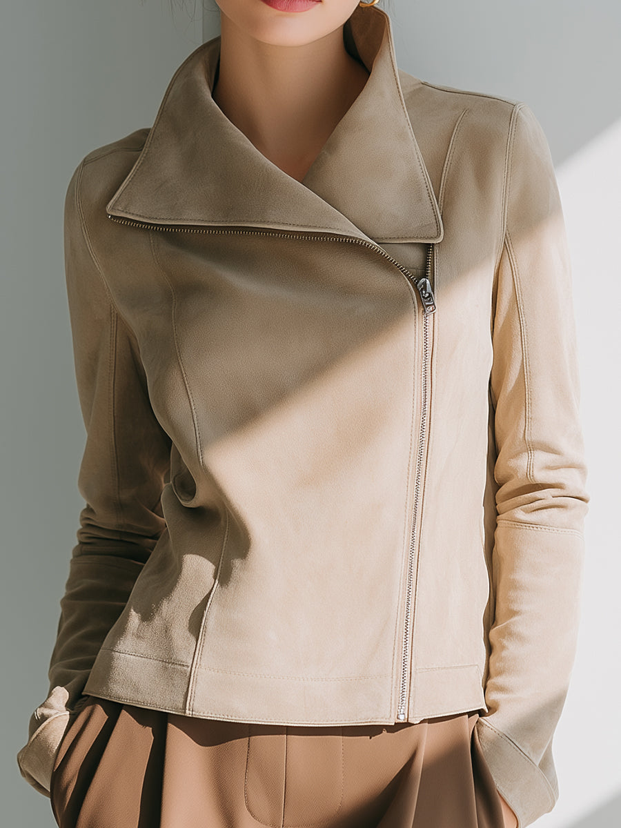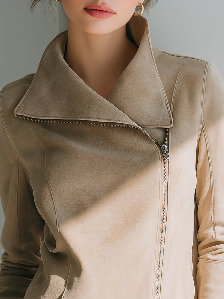 The Taupe Suede Asymmetric Zip Jacket from Crovaya embodies pure elegance through simplicity. Rendered in a muted taupe tone, this jacket blends soft femininity with contemporary structure, creating a piece that transitions seamlessly between seasons. Its clean asymmetric front zip and minimal stitching emphasize the beauty of the suede itself — smooth, pliable, and quietly luxurious. The sleek collar design frames the neckline gracefully, adding a modern architectural note to the silhouette.