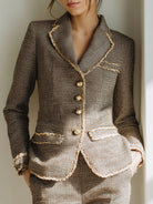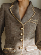 Taupe Tweed Blazer With Fringe Trim And Gold Buttons