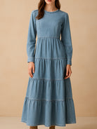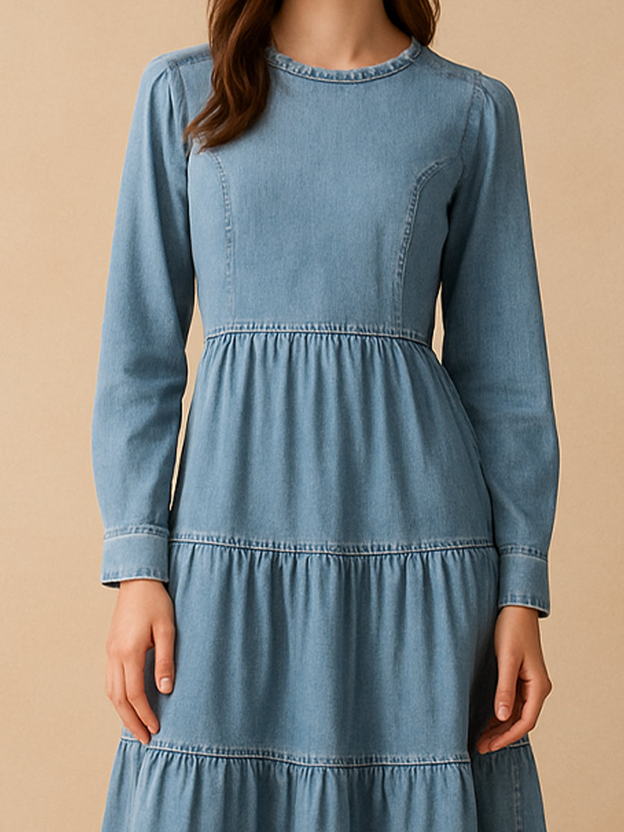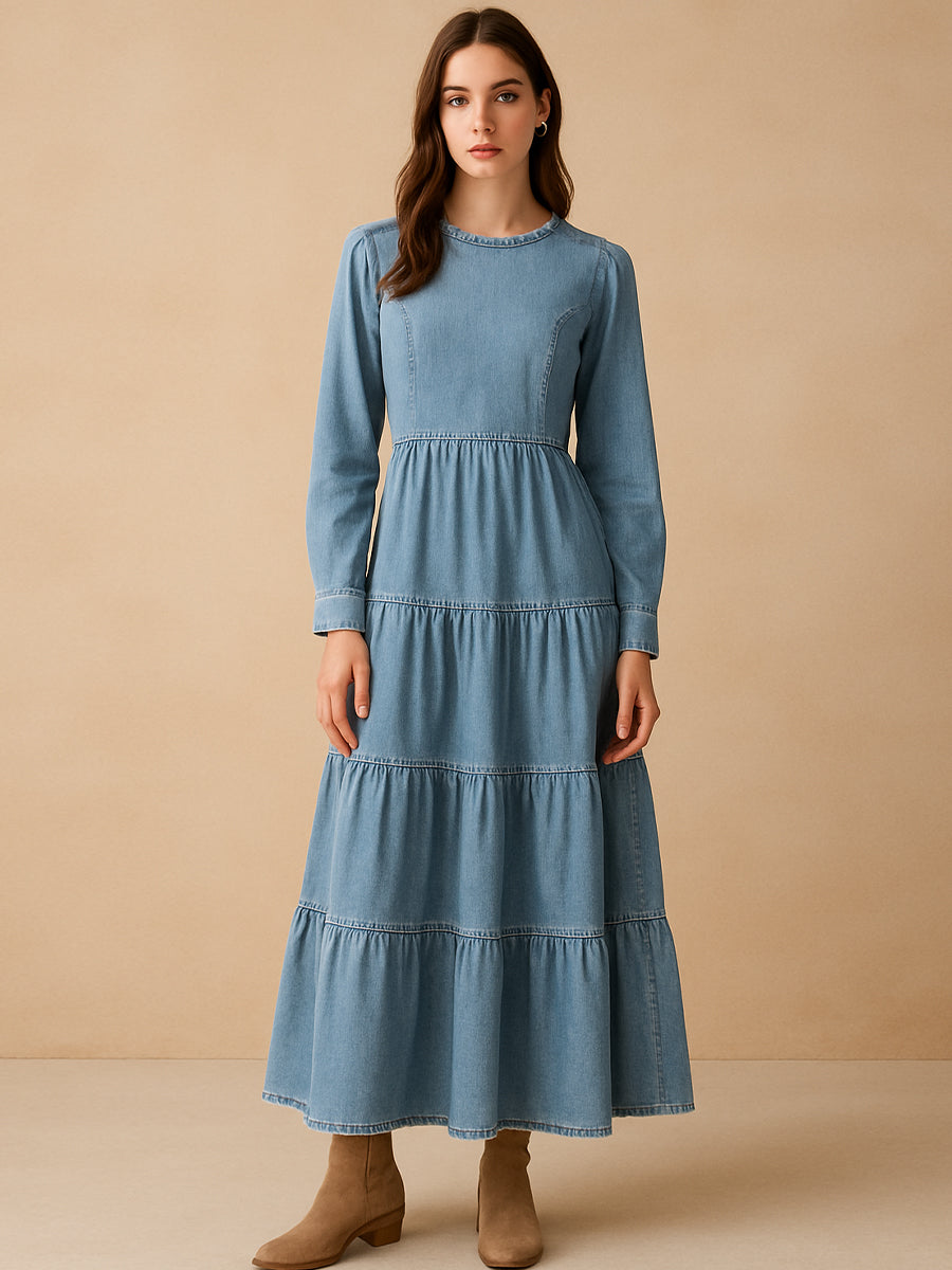 The Tiered Maxi Denim Dress captures modern romance in a minimalist form. Designed with long sleeves and a softly structured bodice, the silhouette flows into tiered panels that create a graceful sense of movement. The light-wash denim fabric adds a casual charm, balancing femininity with relaxed ease.