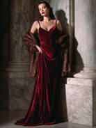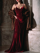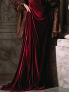 The gown’s silhouette is both sculpted and fluid, featuring a fitted bodice with delicate gathered detailing that enhances natural curves, and slender straps that balance refinement with allure. Flowing into a floor-length skirt, the velvet drapes effortlessly to create a regal cascade, ensuring every movement exudes sophistication. A subtle side drape elongates the figure, making it ideal for both grand entrances and intimate gatherings.