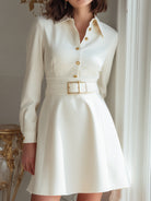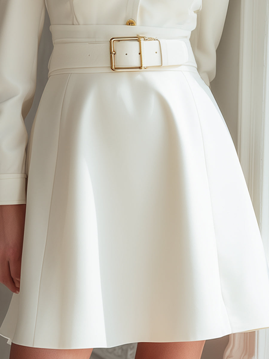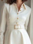 Add a dose of elegance to your wardrobe with this white belted shirt dress. Made from luxurious fabric with a silky finish, this dress features gold button detailing and a statement belt that cinches the waist for a flattering hourglass shape. The long sleeves and button-down front provide a structured look, while the feminine pleats at the skirt add a sense of movement and grace.