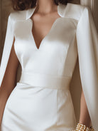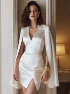 Elegant, modern, and impeccably refined, the White Cape Sleeve Satin Mini Dress with Sculpted V-Neckline brings a fresh interpretation of sophisticated evening style. Crafted from smooth, luminous satin, this dress offers a clean, architectural silhouette designed for the woman who values both minimalism and elevated drama.