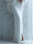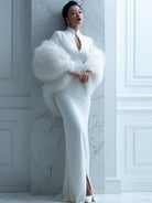 The highlight of this piece is the detachable faux fur capelet, designed in voluminous textures that gracefully drape over the shoulders, creating a striking contrast against the gown’s clean lines. This detail not only adds warmth but also elevates the dress into a winter-ready masterpiece suitable for high-profile galas, weddings, or evening receptions. Finished with hidden tailoring at the waist, the gown flatters the natural form while allowing comfortable movement. Pair with pearl drop earrings or crystal studs to complete an ethereal, ice-queen-inspired look.