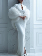 White High-Collar Gown With Luxe Faux Fur Capelet