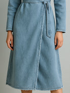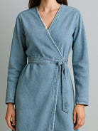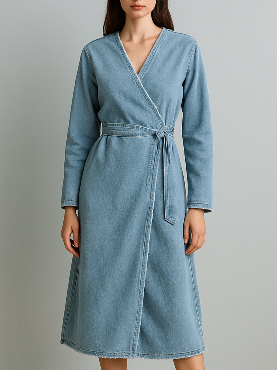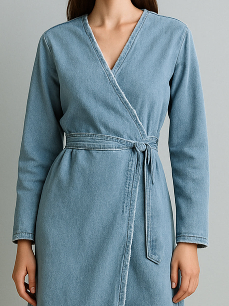 The Wrap-Style Belted Denim Midi Dress embodies the quiet confidence of modern femininity. Featuring a flattering V-neckline and adjustable wrap design, it allows a customized fit that accentuates the waist while ensuring all-day comfort. The light-wash denim lends a soft yet structured feel, perfect for transitional seasons.