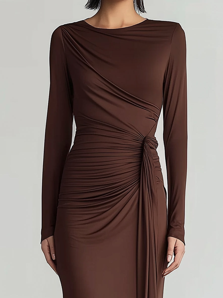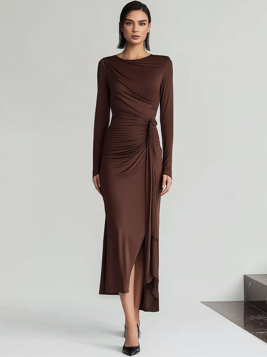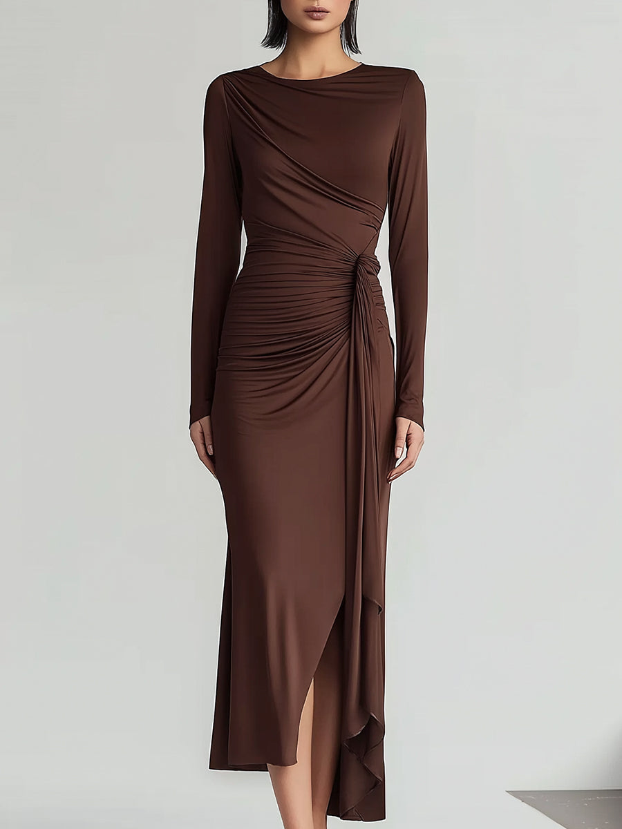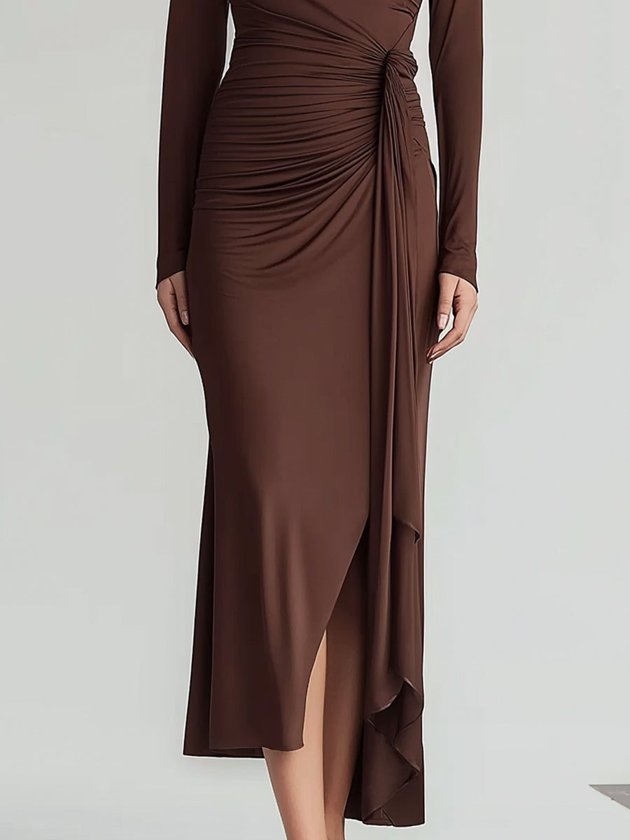 Sculpted Brown Ruched Midi Dress With Side Slit