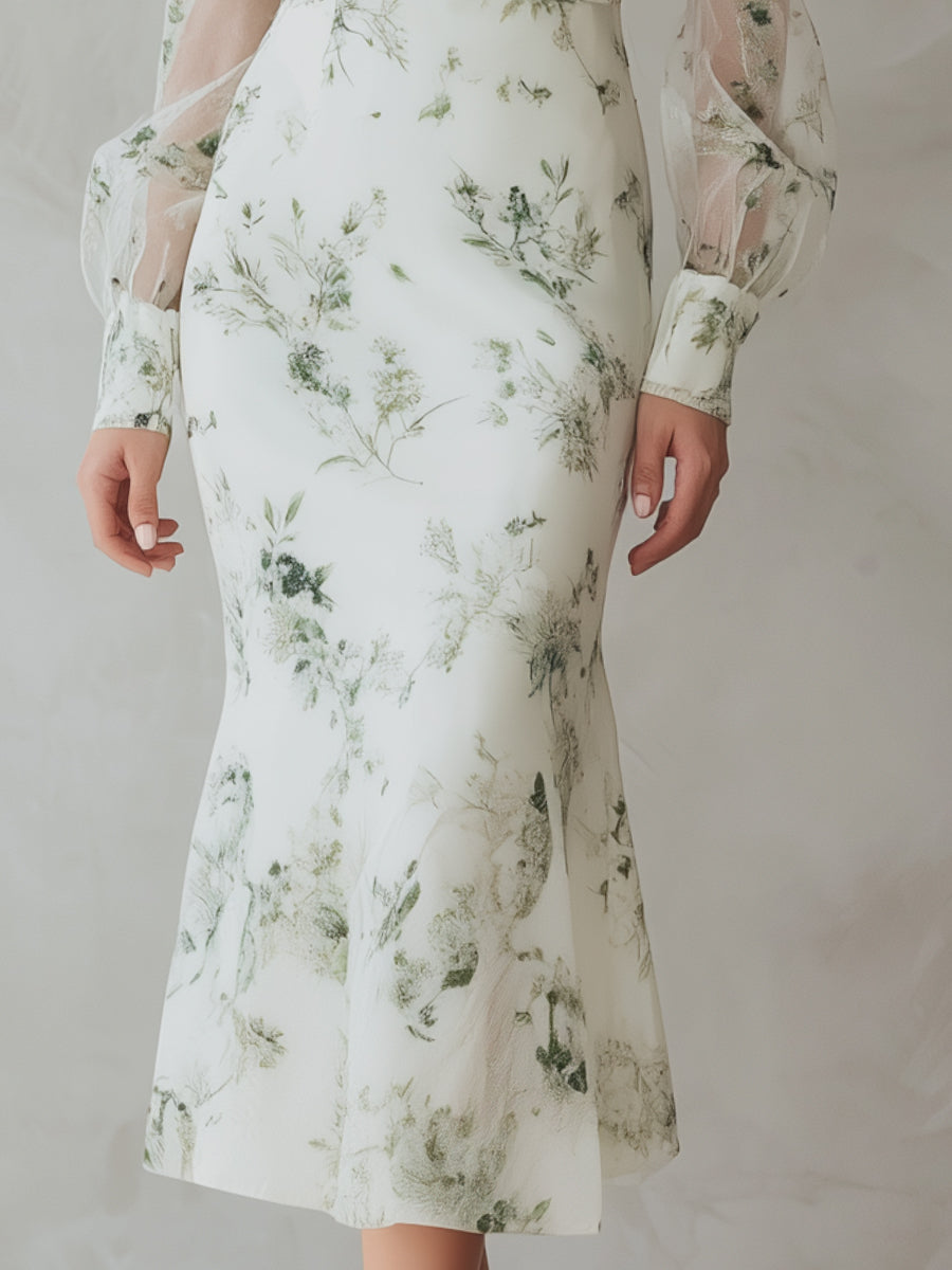 Floral White Midi Dress With Sheer Sleeves