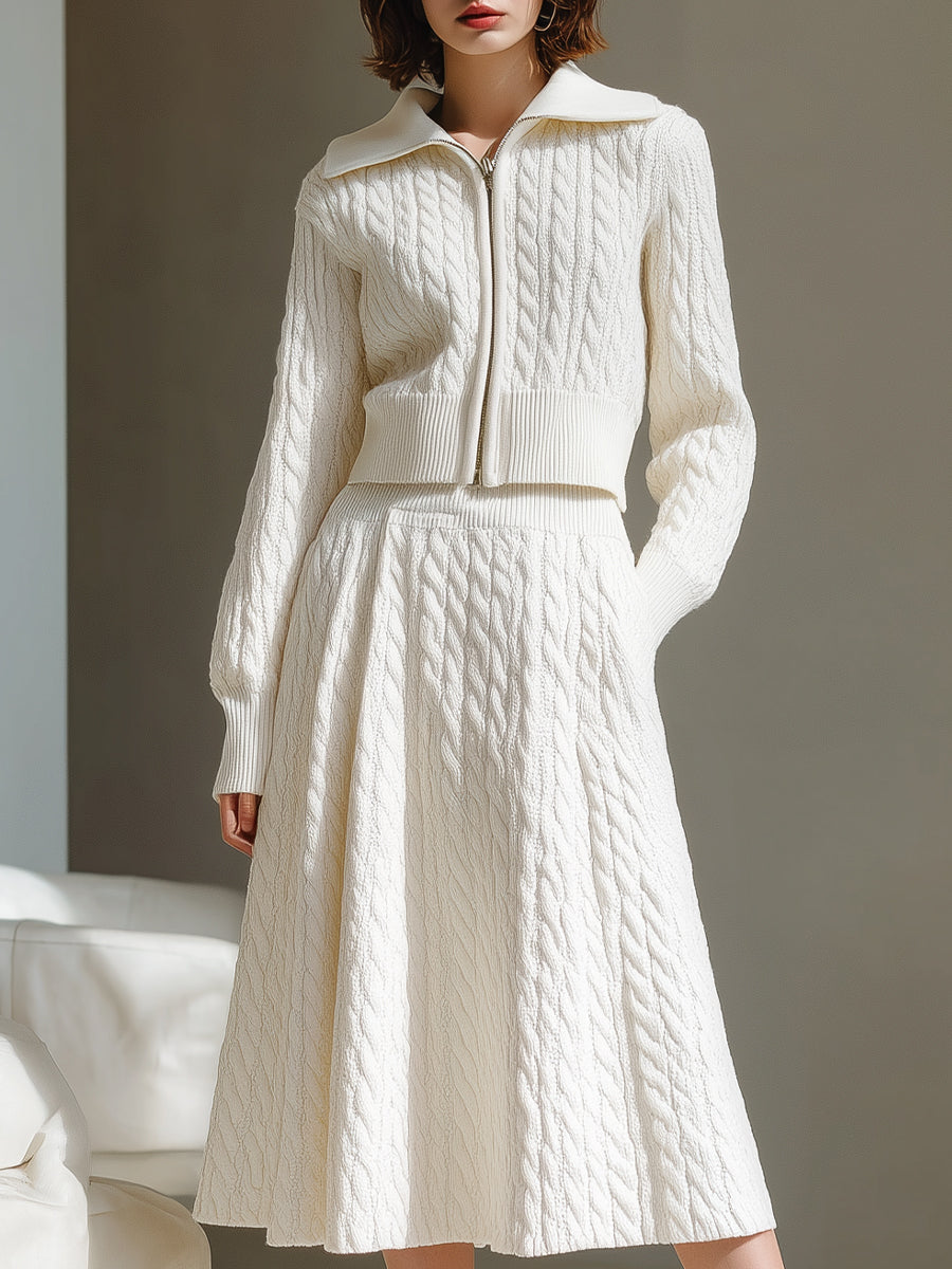 Knitted Sweater And Skirt Set With Zip-Up Collar In Ivory