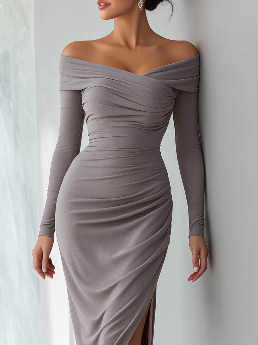 Sophisticated Off-Shoulder Grey Ruched Midi Dress