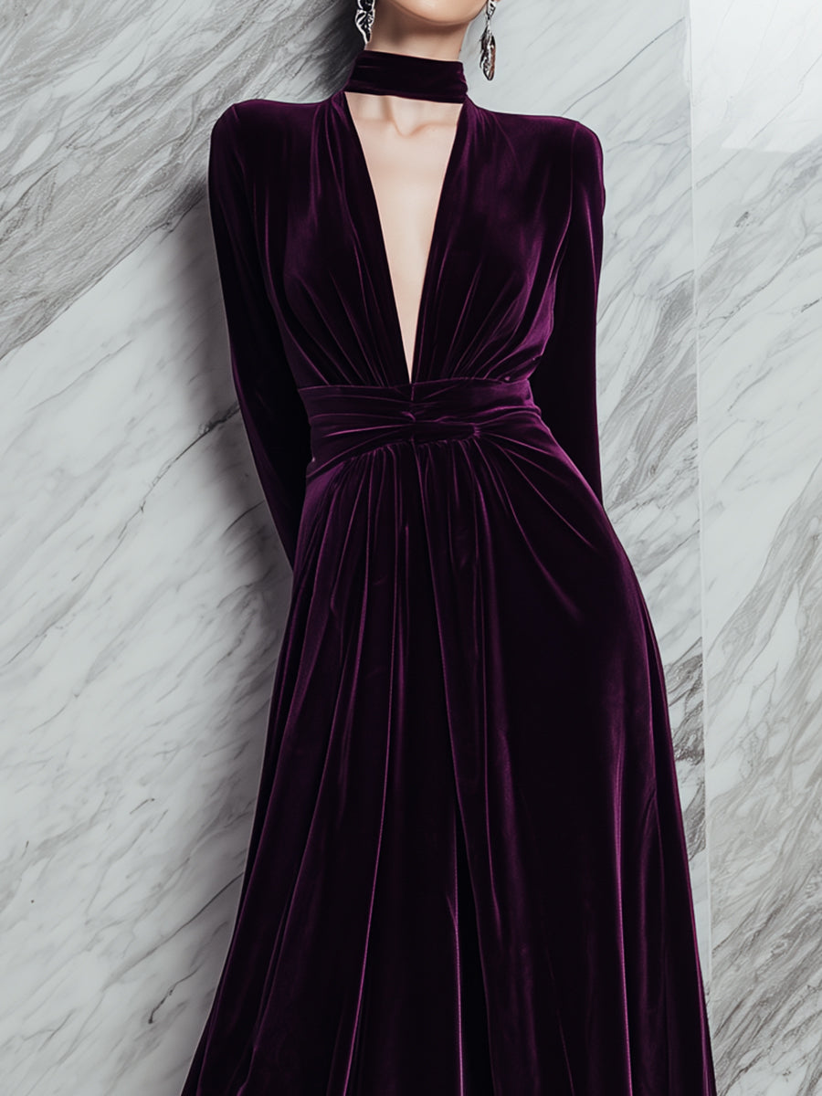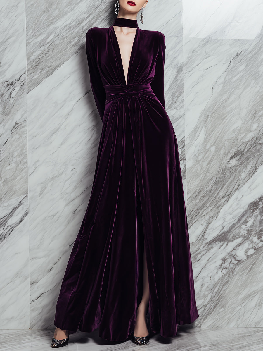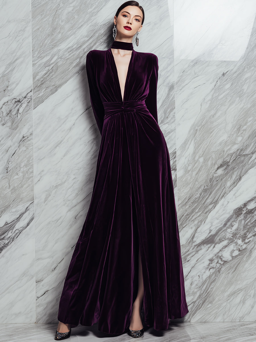 Velvet Choker Maxi Gown With Plunging Neckline In Aubergine