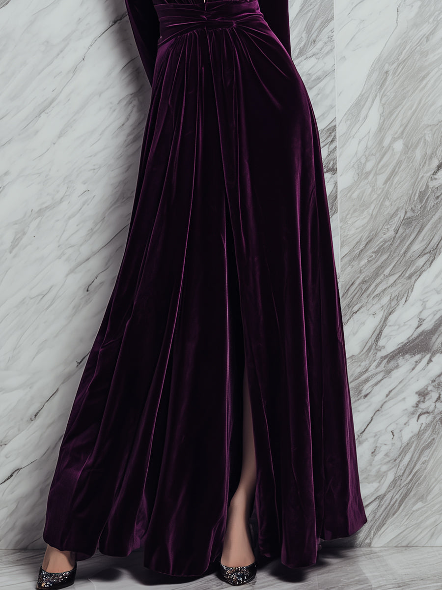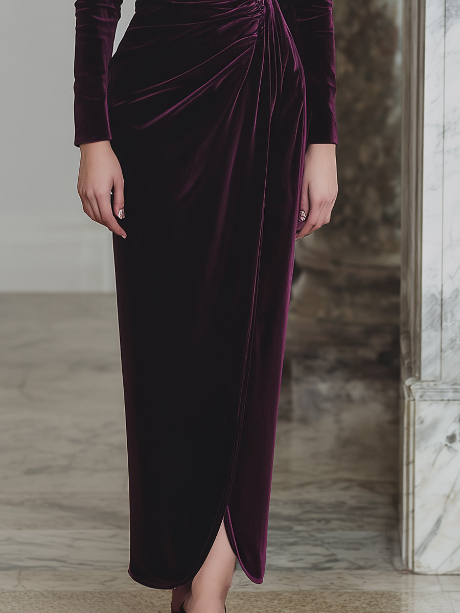 Long-Sleeve Velvet Wrap Gown With Side Slit In Bordeaux