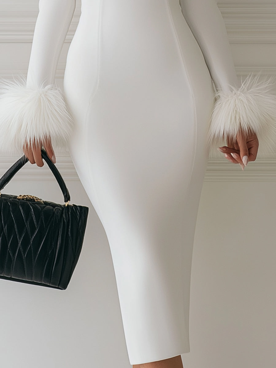 Crovaya White Off-Shoulder Faux Fur Trim Midi Dress