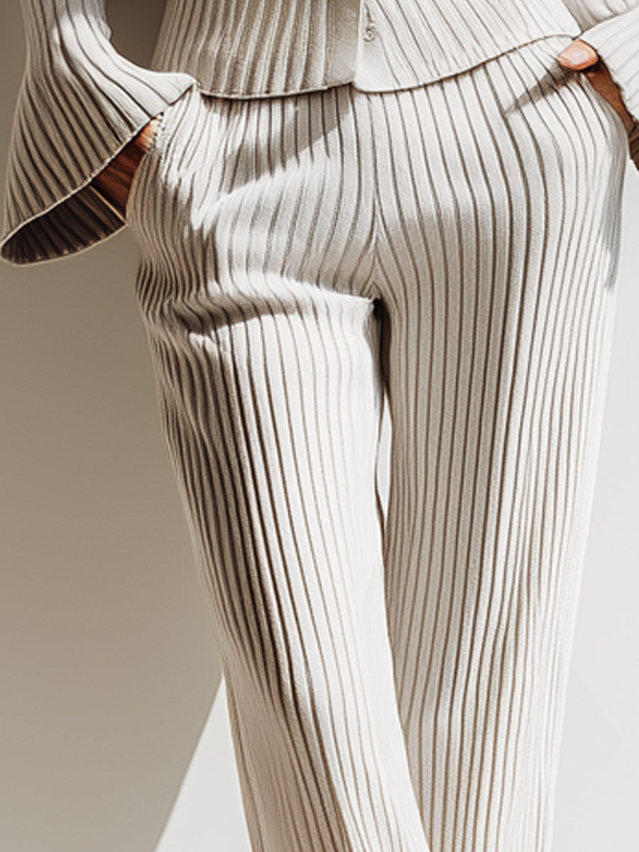 Ribbed Button-Up Top And Wide-Leg Pants Set