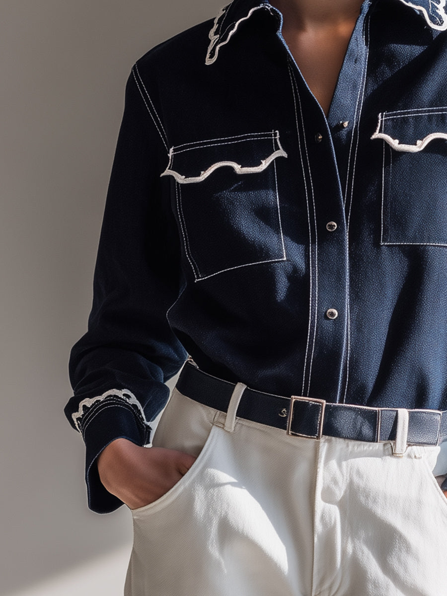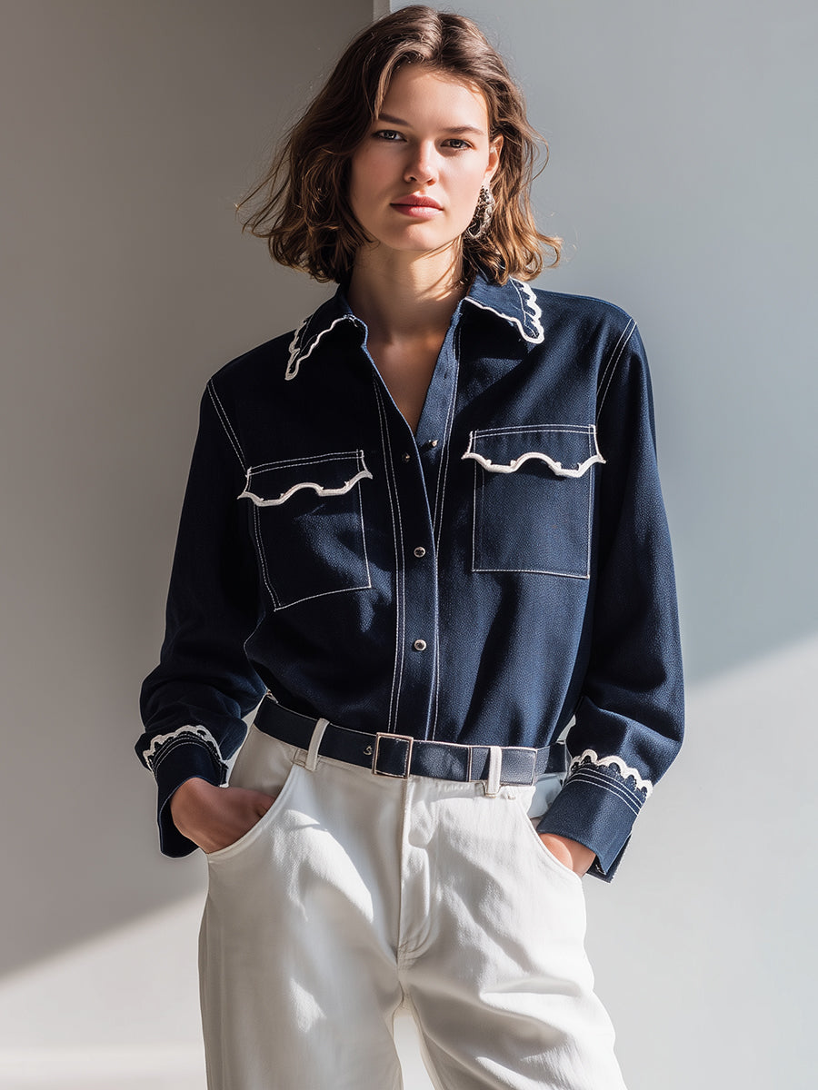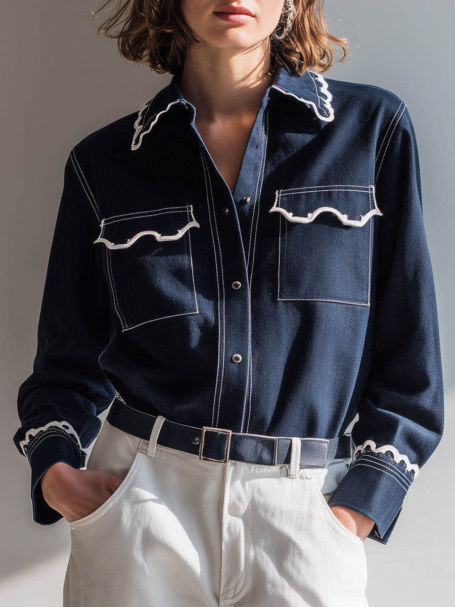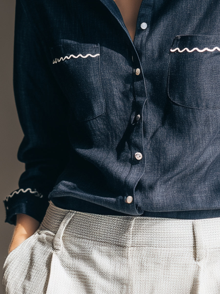 Classic Collared Denim Shirt With Subtle Frayed Edging