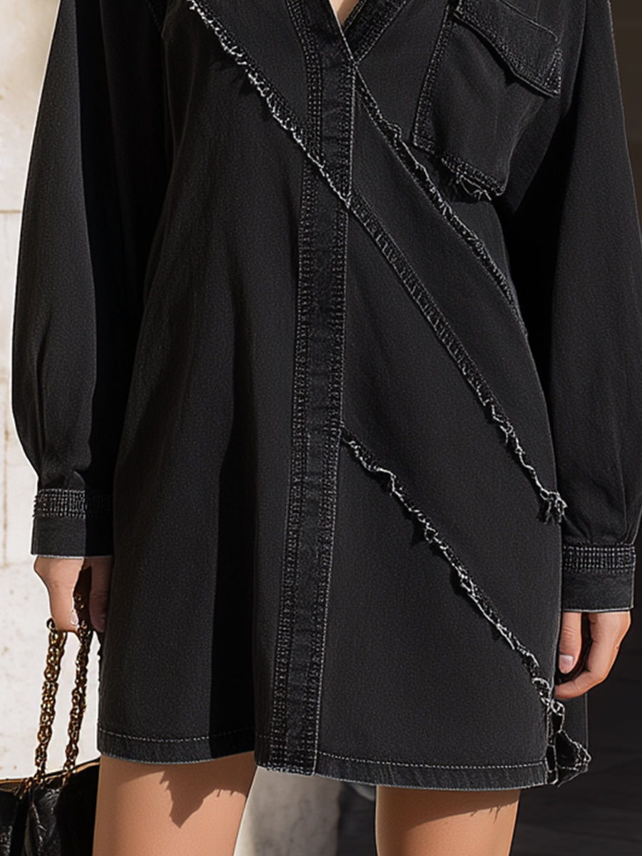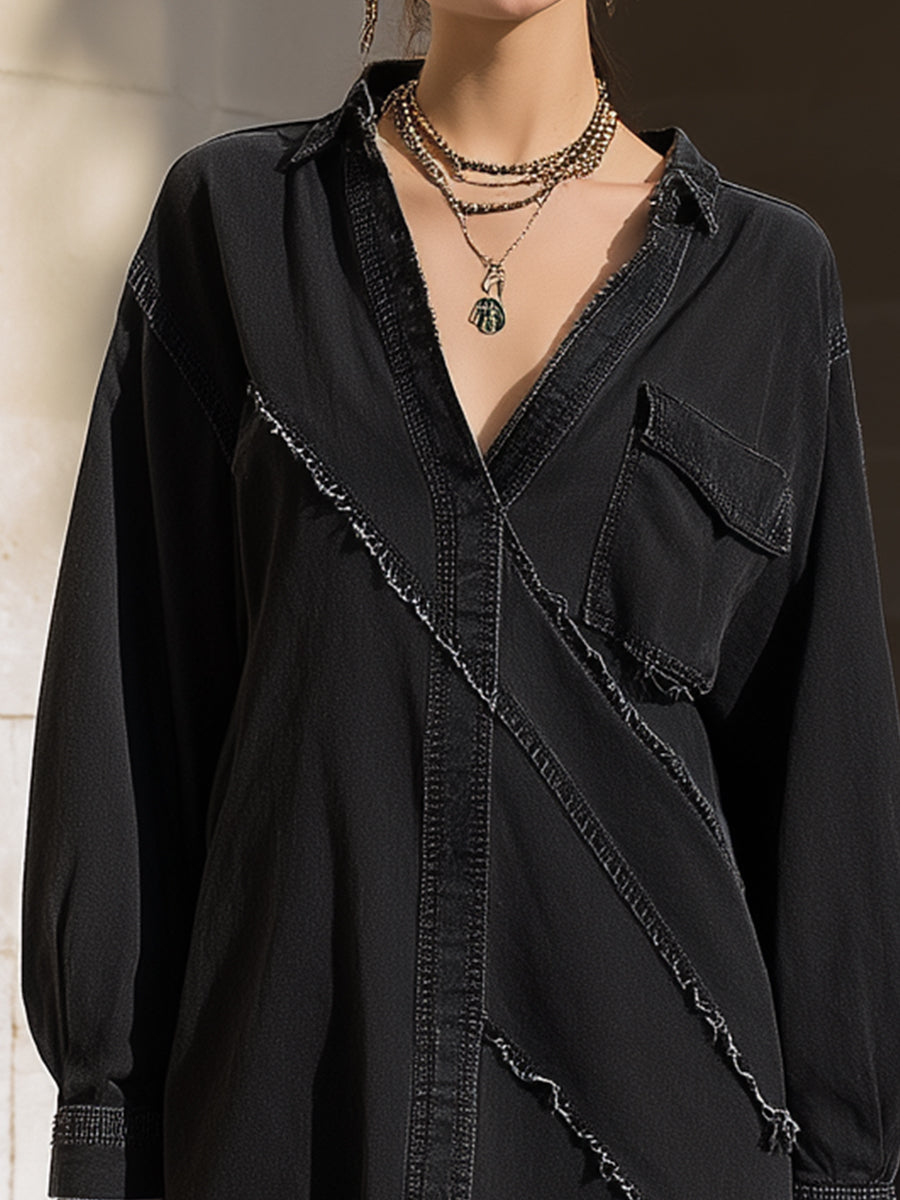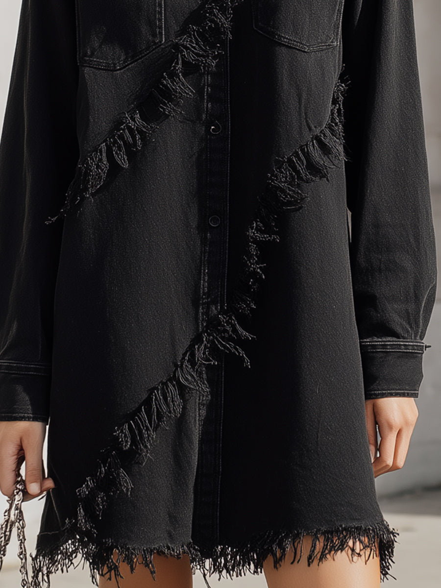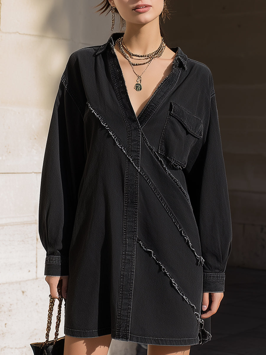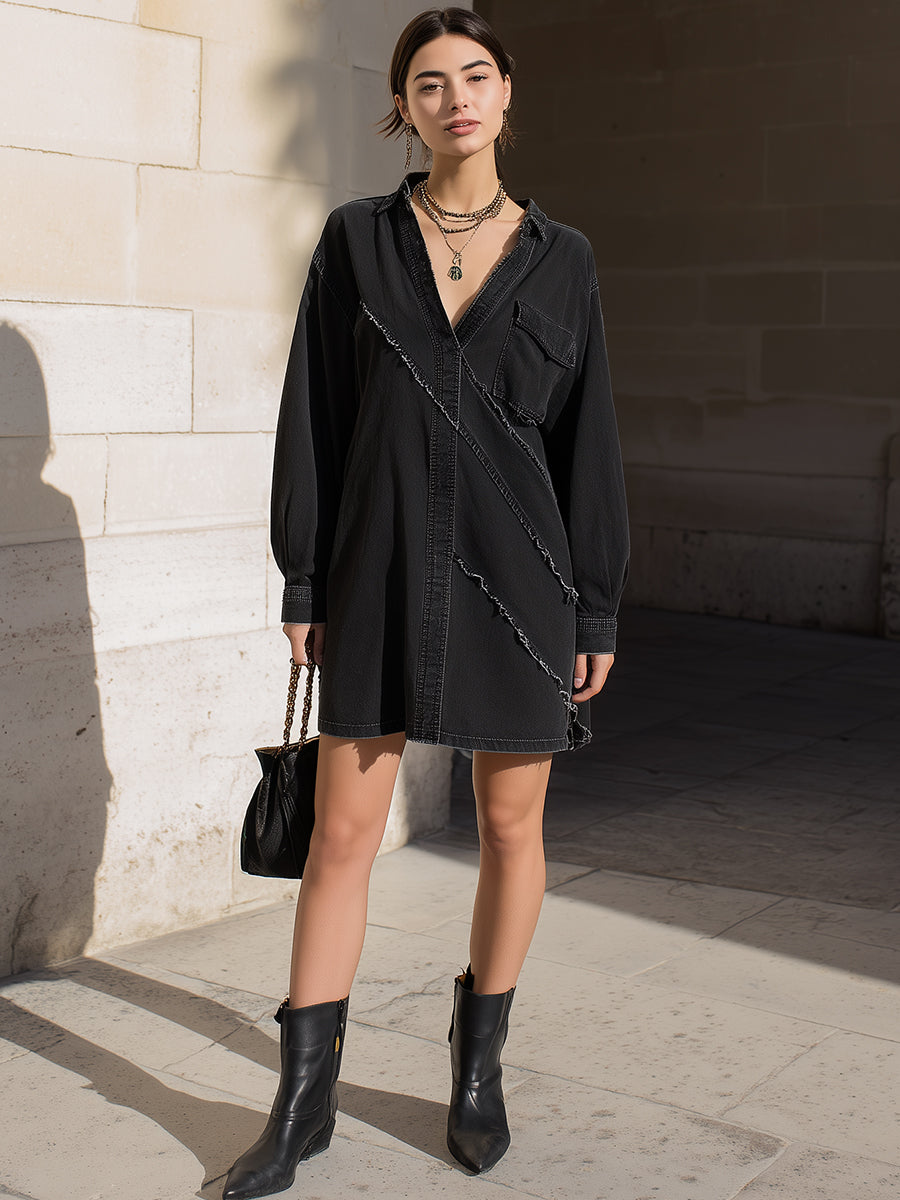Edgy Black Denim Shirt Dress With Asymmetric Stitching