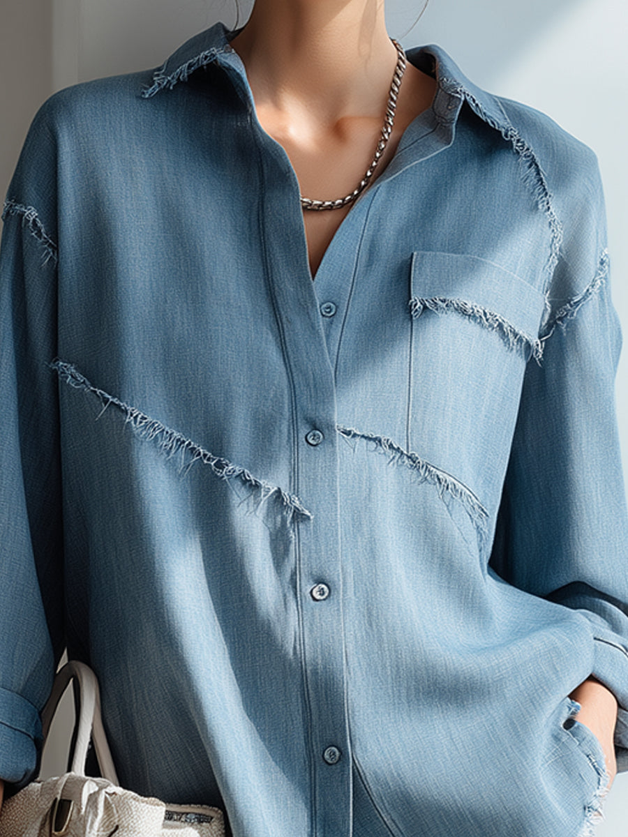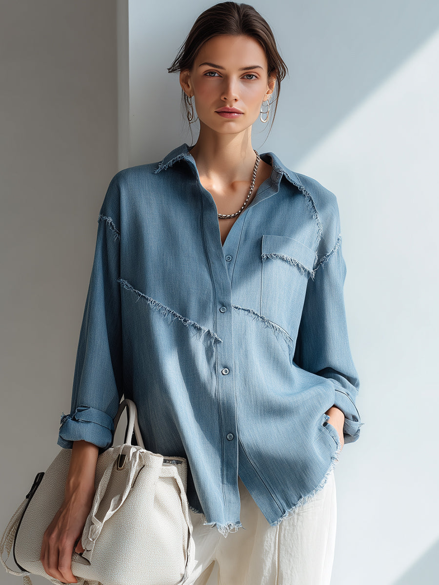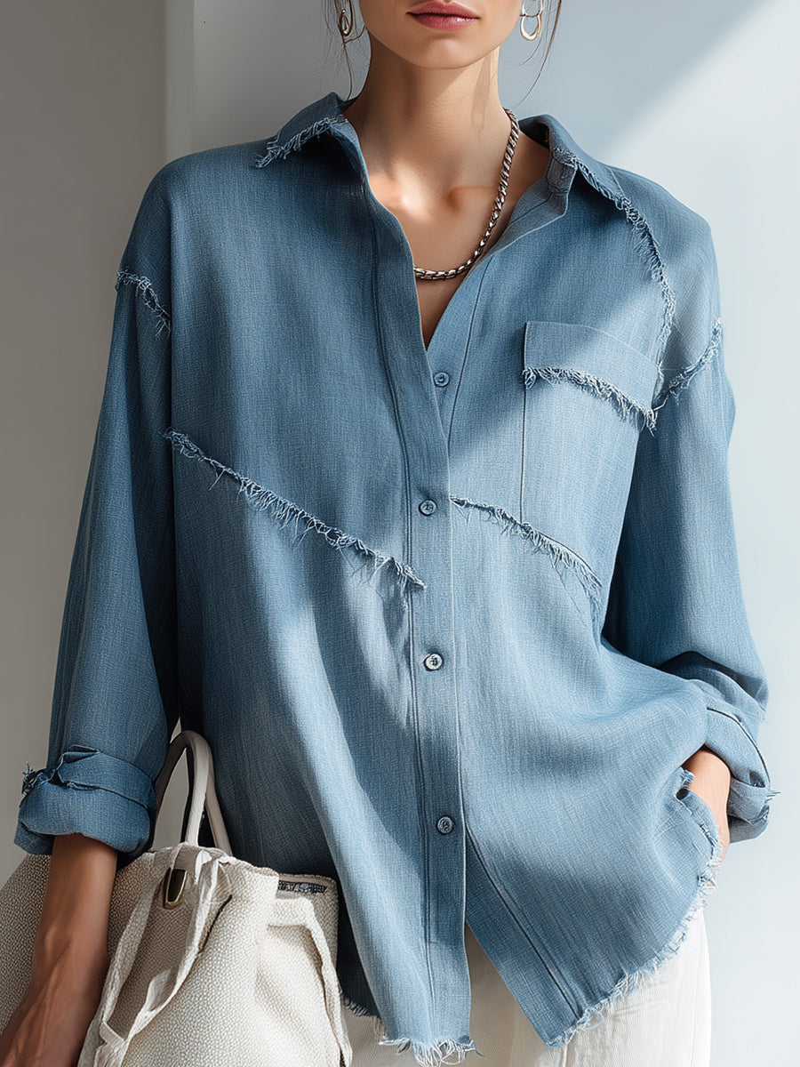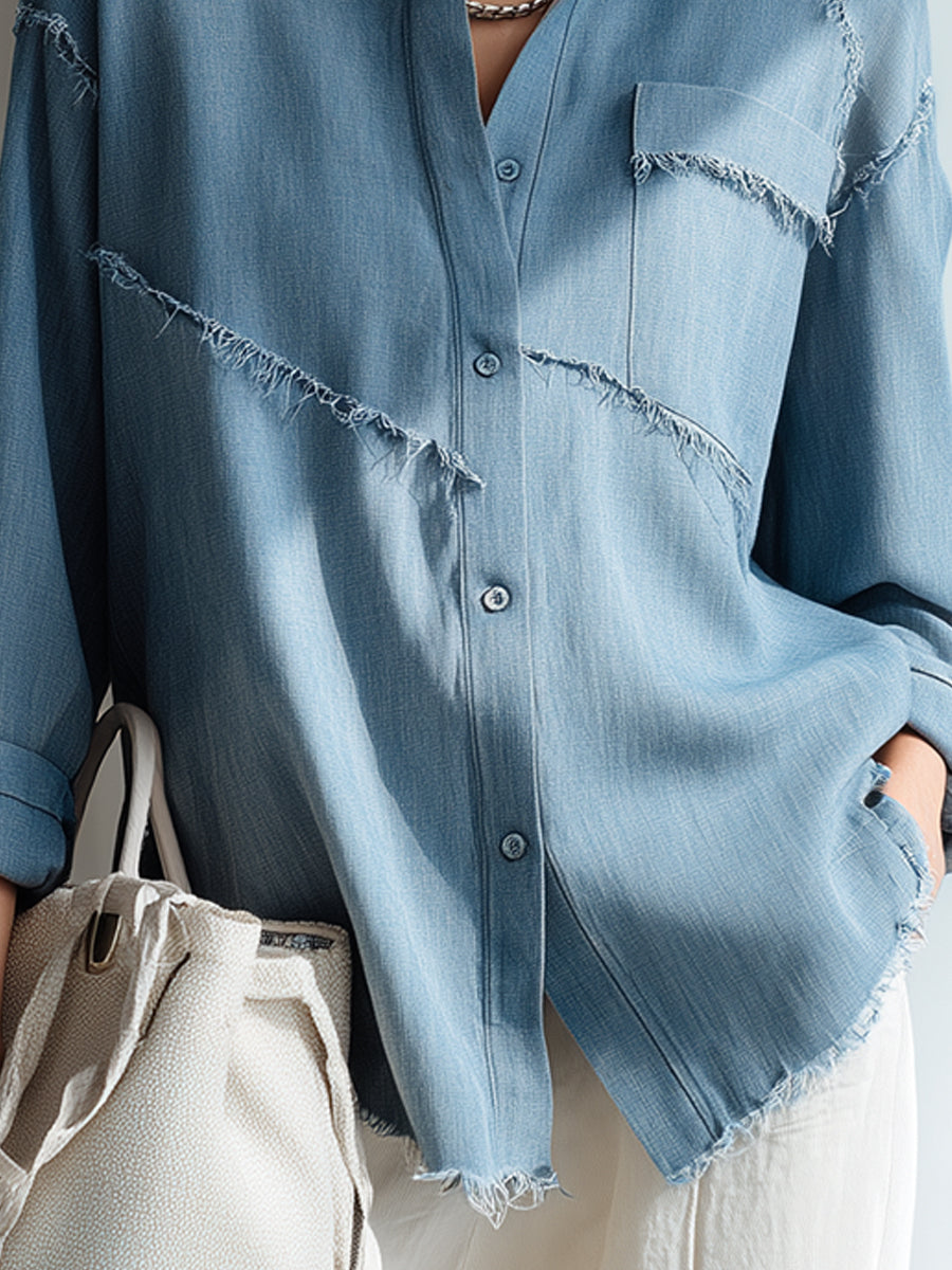 Relaxed Fit Denim Top With Modern Frayed Accents