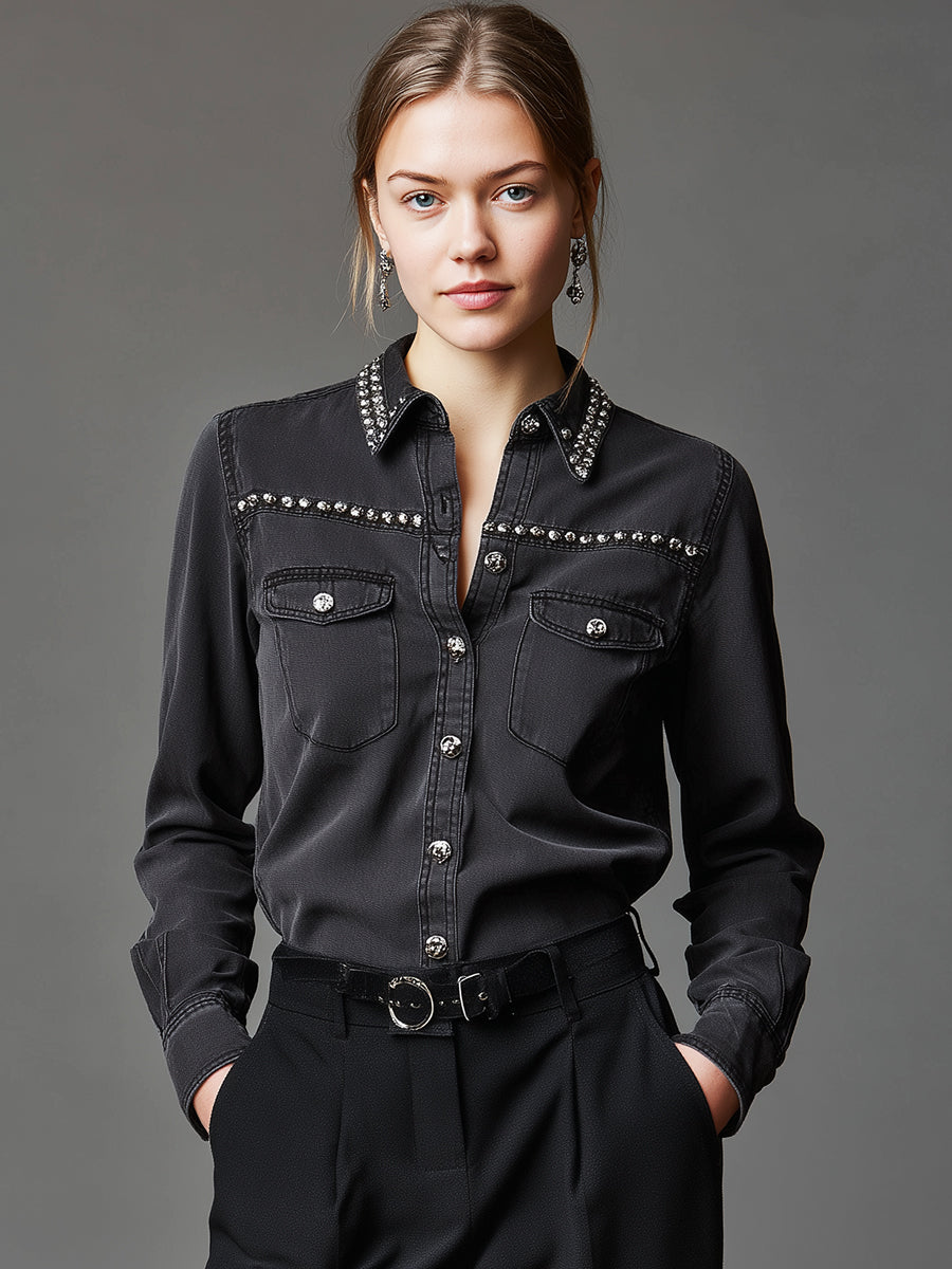 Elegant Black Denim Shirt With Rhinestone Embellishments