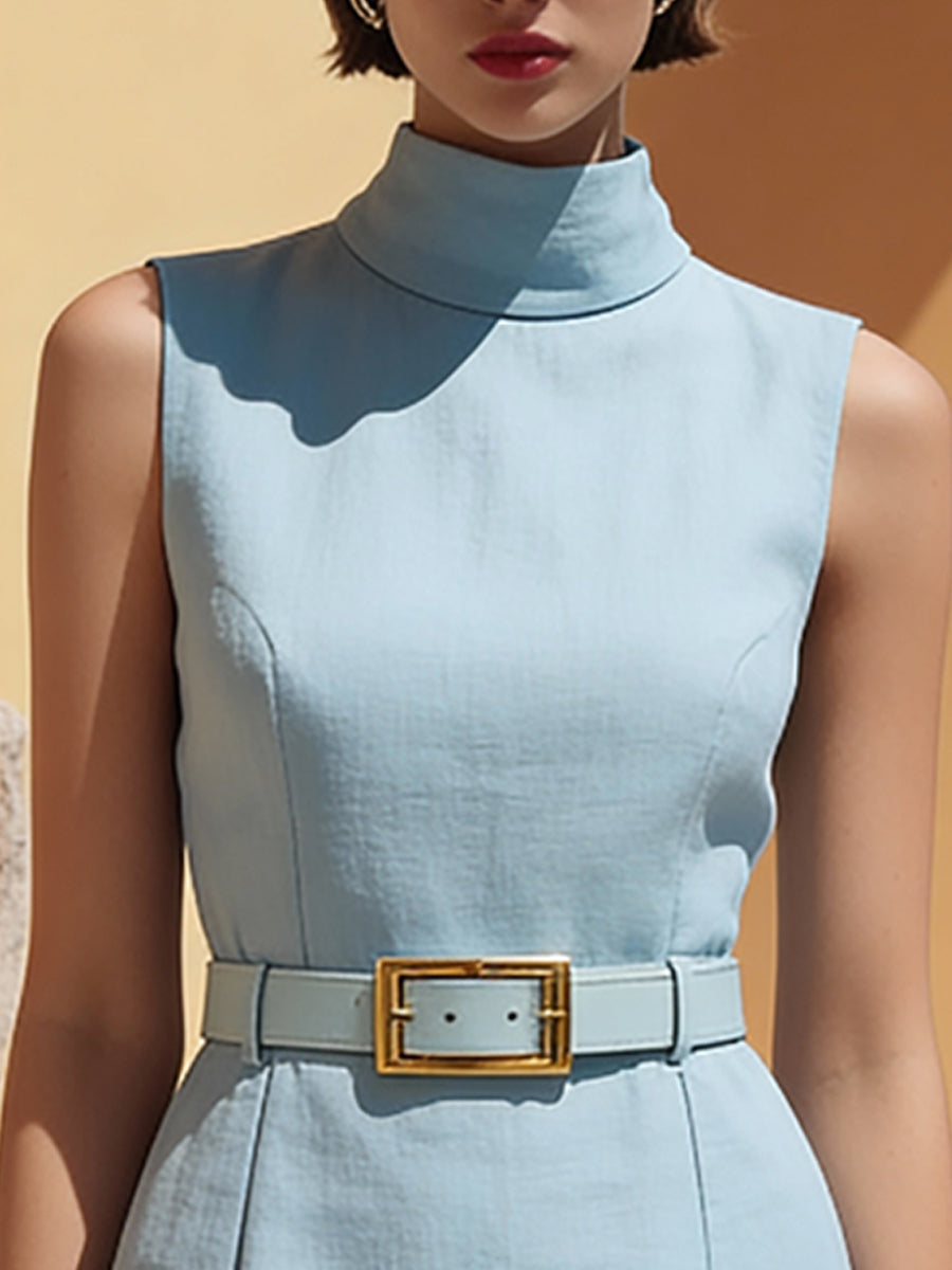 Crovaya High-Neck Belted Sleek Tailoring Midi Dress