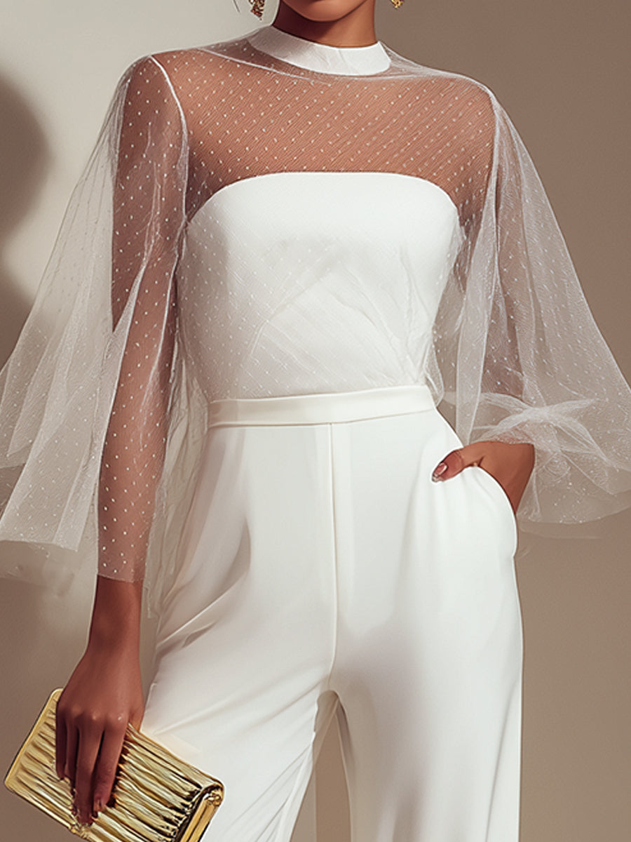 White Sweetheart Jumpsuit With Puff Sheer Sleeves And Wide-Leg Fit