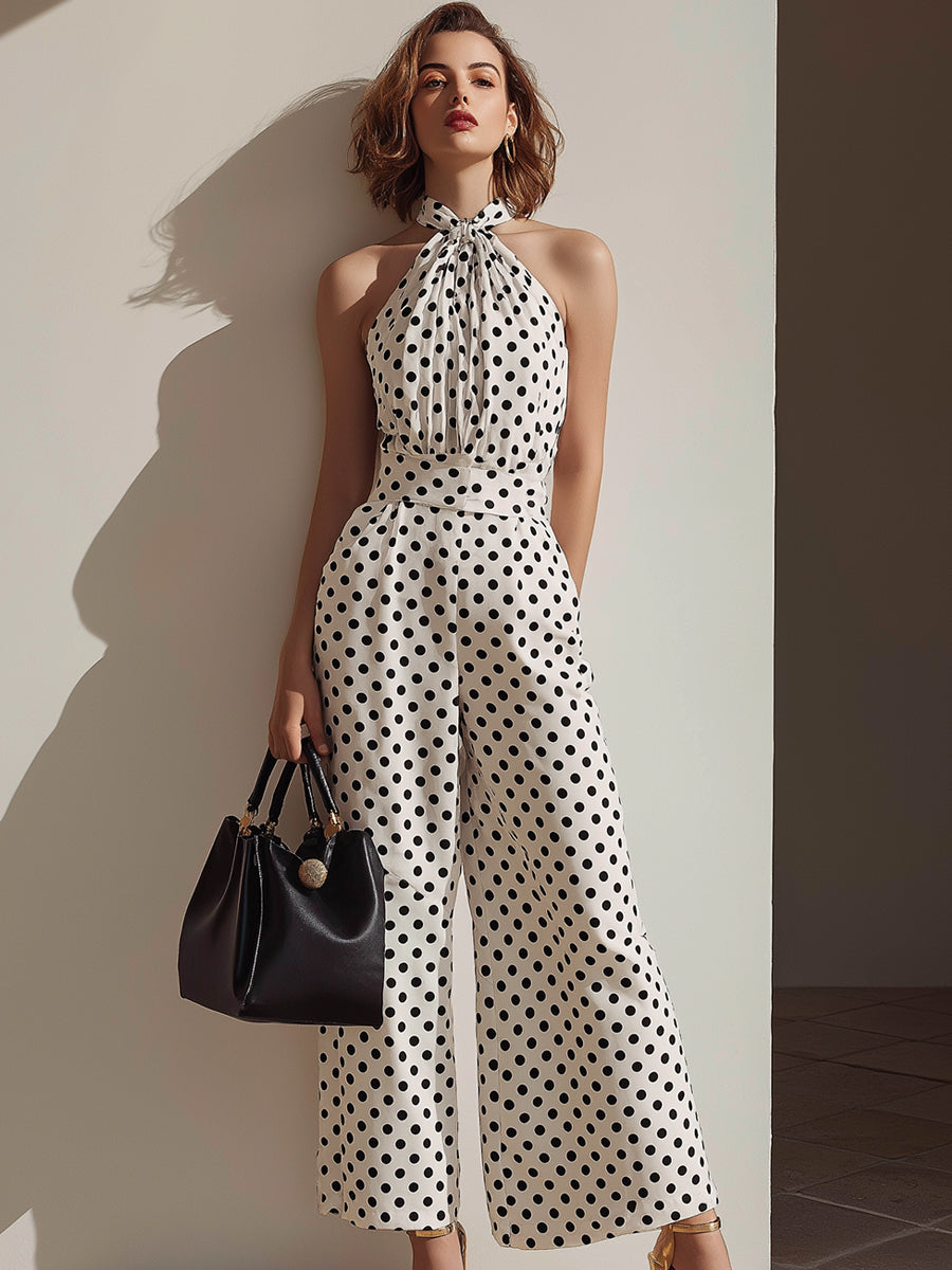 Polka Dot Halter Wide-Leg Jumpsuit With Pleated Bodice