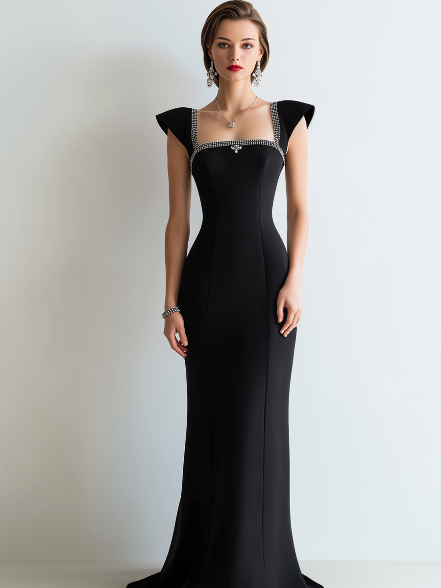 The structured square neckline is framed with delicate embellishment, adding a refined glimmer that draws attention toward the décolletage without overwhelming the minimalist design. Sculpted cap sleeves offer a contemporary take on formal dressing, balancing softness with angular precision. Vertical paneling throughout the bodice and skirt enhances length and symmetry, while the floor-grazing hem elongates the frame, ensuring a sweeping and graceful presence at any event.
